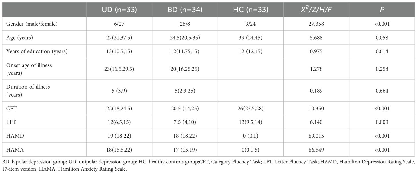 Table 1 presents the demographic and clinical characteristics of all participants. No significant differences were observed among the three groups of subjects concerning age and years of education and family history. There was no significant difference in onset age of illness, duration of illness, HAMD scores and HAMA scores between BD and UD (HAMD: Z = 3.314, P = 0.632; HAMA: Z = 4.658, P = 0.510). Compared with the UD group, the BD group was more male.