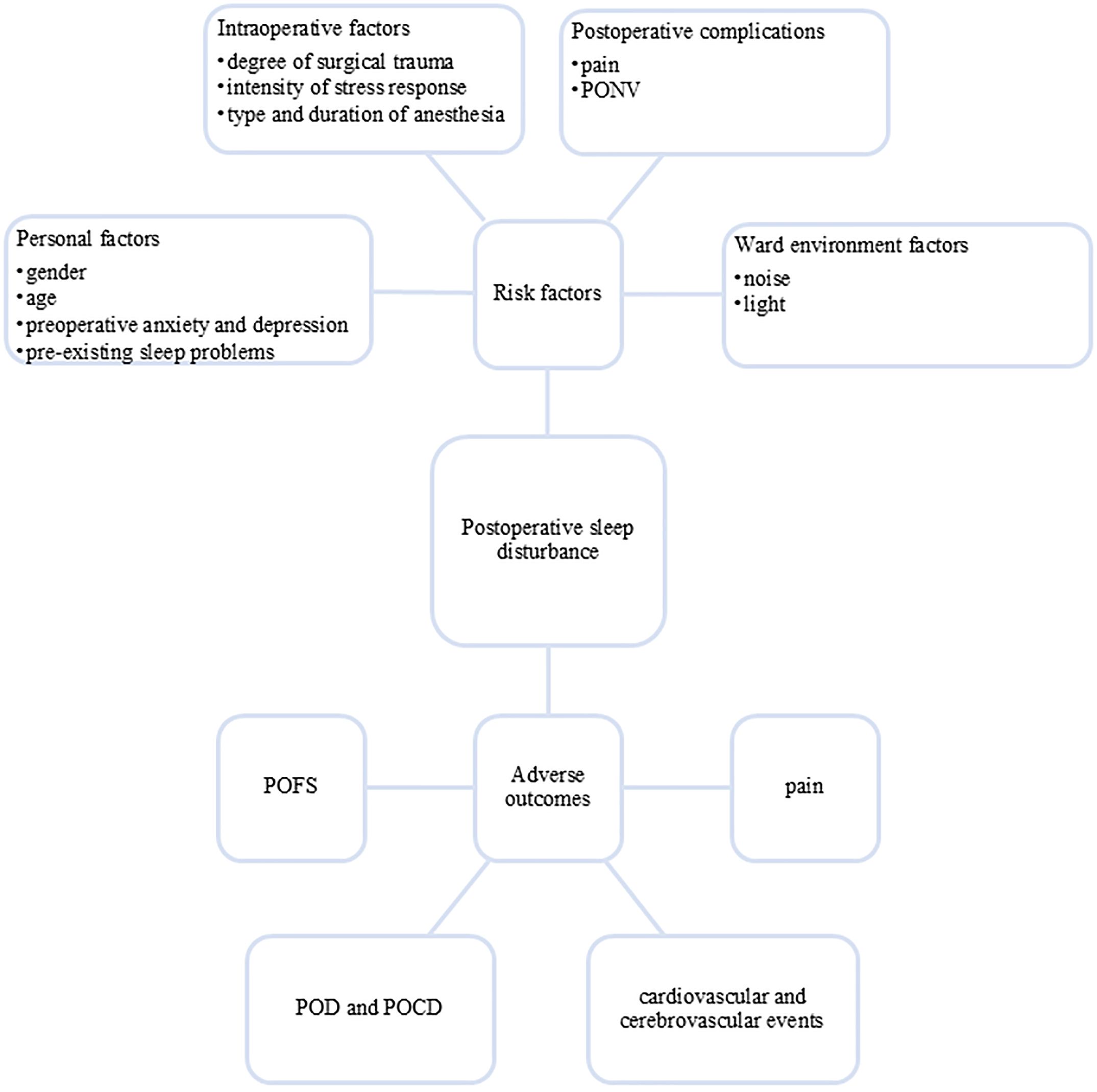 Flowchart illustrating risk factors and adverse outcomes of postoperative sleep disturbance. Risk factors include intraoperative factors, postoperative complications, personal factors, and ward environment factors. Adverse outcomes include POFS, POD and POCD, pain, and cardiovascular and cerebrovascular events.