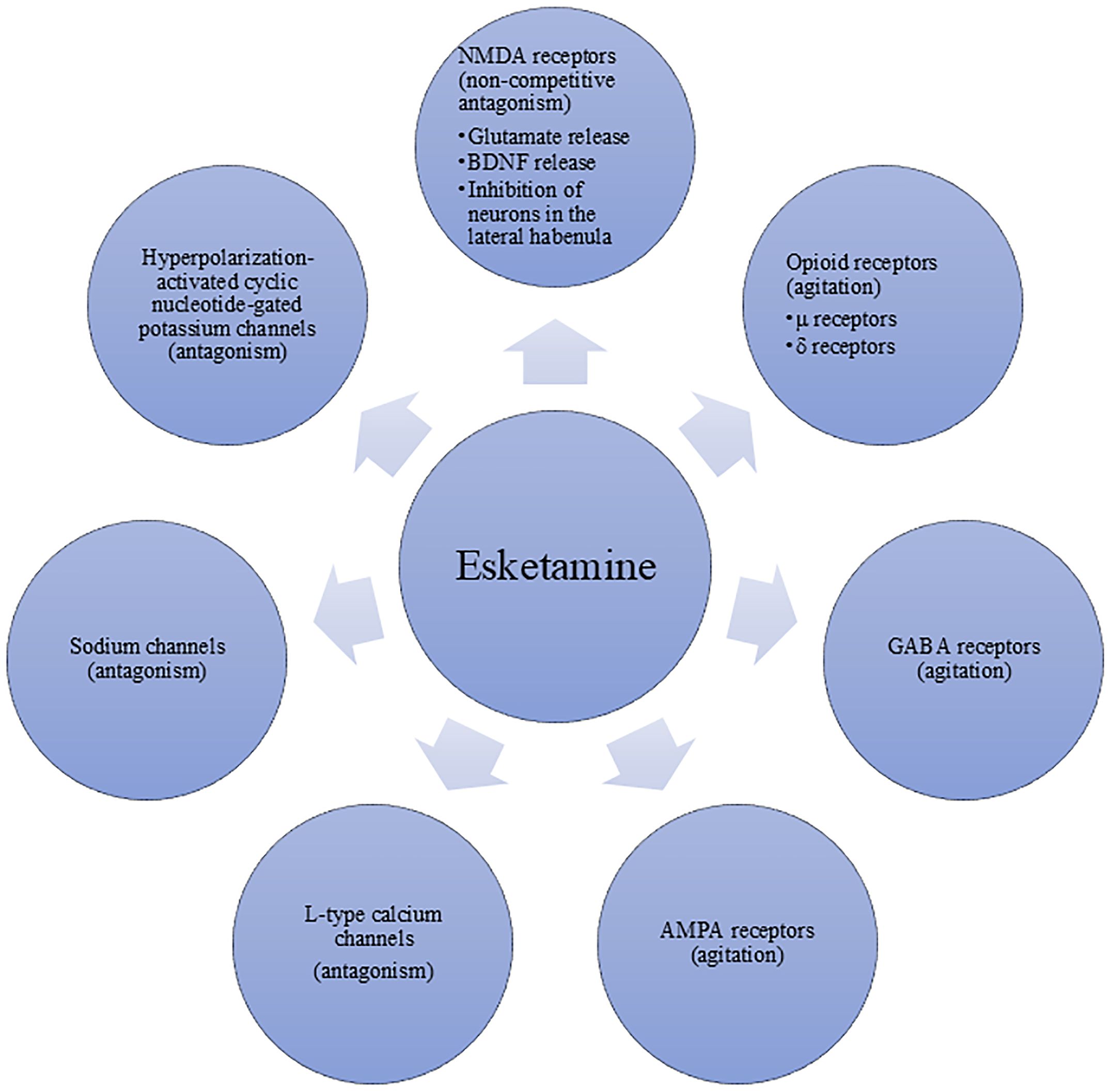 Diagram illustrating the pharmacological effects of Esketamine. Central circle labeled “Esketamine” is surrounded by arrows pointing to seven peripheral circles: NMDA receptors (non-competitive antagonism), Opioid receptors (agitation), GABA receptors (agitation), AMPA receptors (agitation), L-type calcium channels (antagonism), Sodium channels (antagonism), and hyperpolarization-activated cyclic nucleotide-gated potassium channels (antagonism).