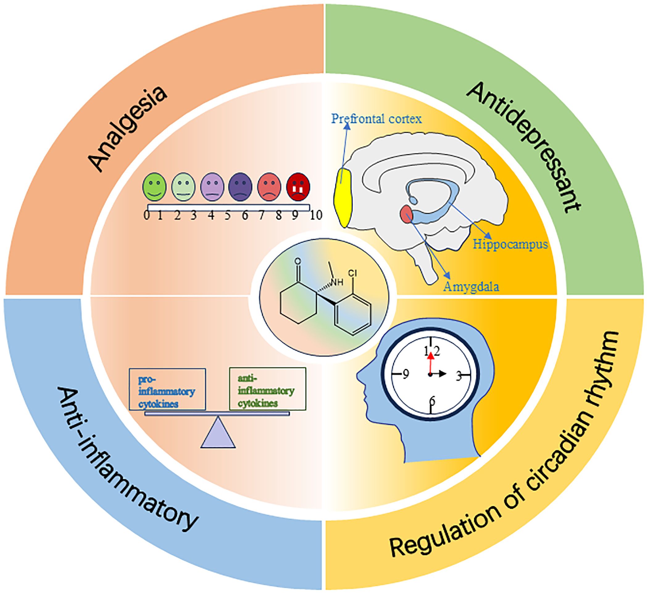 Sleep regulation is governed by two primary systems: the circadian rhythm and homeostasis regulation (103). The circadian rhythm represents the 24-hour cycle of physiological and behavioral variations in organisms, controlled by the circadian clock within the suprachiasmatic nucleus (SCN) of the hypothalamus. In humans, the most prominent circadian rhythm is the alternation between sleep and wakefulness. Circadian rhythm disturbance is closely related to a variety of diseases, such as depression, sleep disorders, and metabolic syndrome. In recent years, studies have found that ketamine and esketamine not only possess analgesic and rapid antidepressant effects but also play a role in regulating circadian rhythm (104, 105).