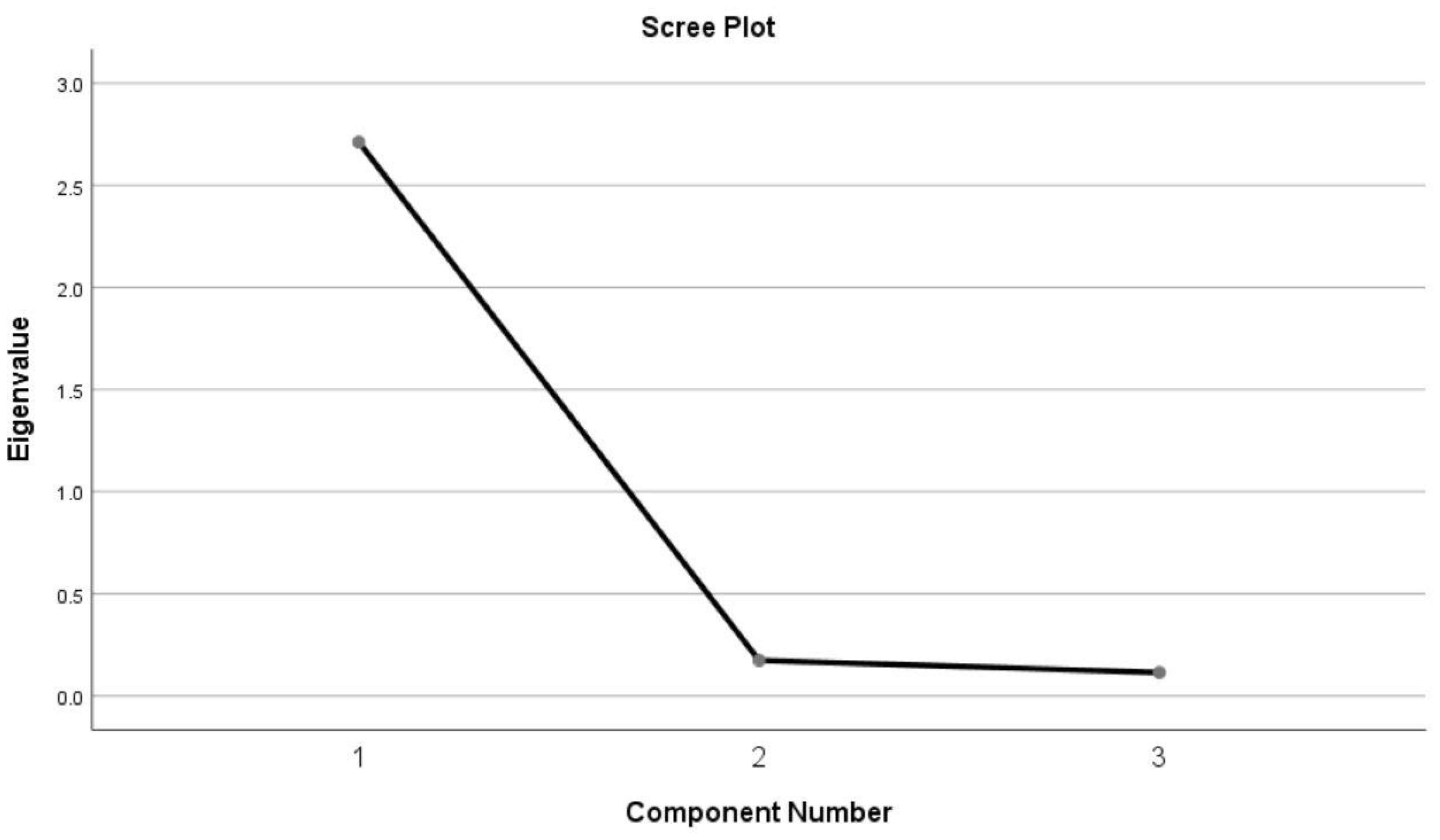 The results of principal component analysis showed one major component with an eigenvalue greater than 1(the value was 2.711), accounting for 90.376% of the total variance (Figure 1). The FIBSER scale could potentially be shortened to focus on the side effect frequency item. The scree plot could provide a relatively comprehensive explanation.