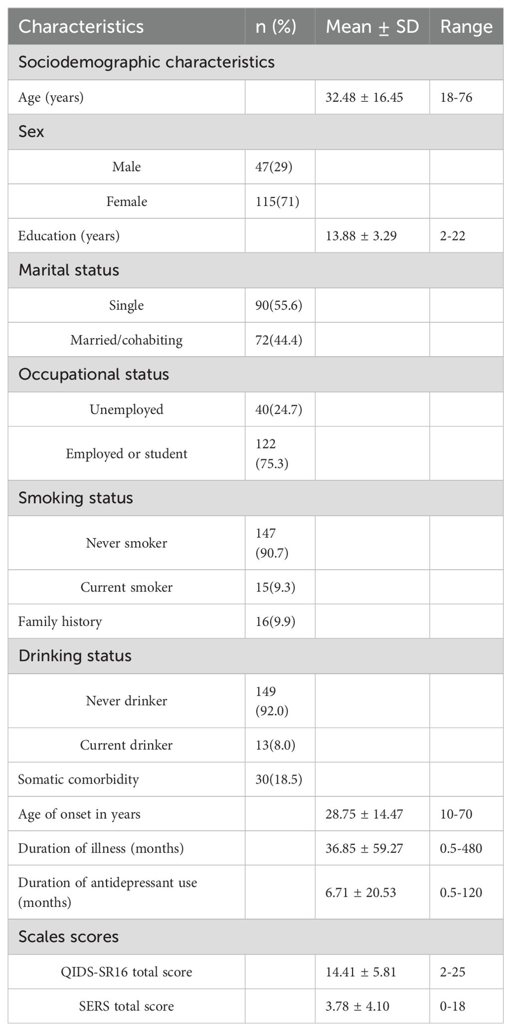 A total of 162 participants were included in the analysis, among whom 115 (71%) were female. The mean age was 32.48 years (SD = 16.45), and the mean age of onset in years was 28.75 years (SD = 14.47). The mean duration of antidepressant use was 6.71 months (SD = 20.53). The QIDS-SR16 total score was 14.41 ± 5.81, and the SERS total score was 3.78 ± 4.10. The socio-demographic characteristics and clinical features of participants were summarized in Table 1.