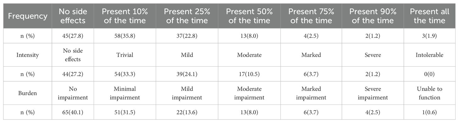 Some limitations should be mentioned. The dimension scores of patients in the study focused on mild to moderate levels, and the frequency, intensity, and burden of severe side effects were relatively low.
