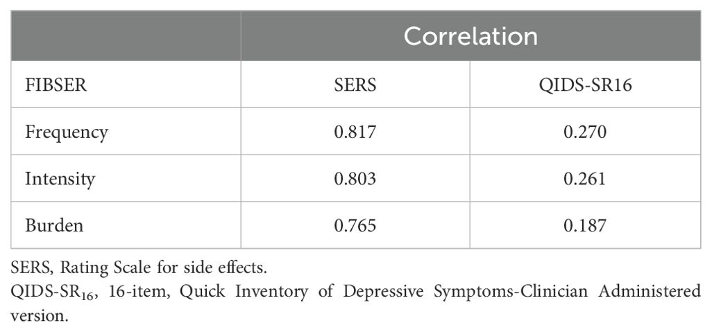 In terms of validity, our study found that the Chinese version of the FIBSER suggested good validity. FIBSER showed a high correlation with the SERS, indicating good criterion validity and its ability to assess the side effects of antidepressant medications effectively. In a previous study, correlations between the PRISE and the FIBSER ranged from 0.22 to 0.32 (20). Although the SERS was initially developed for tricyclic antidepressants and includes 14 domains, with one domain optionally self-administered, this might explain their high correlation. Our study also found that the Chinese version of the FIBSER had a lower correlation with the QIDS-SR16 symptom score, suggesting that FIBSER scores could effectively differentiate side effects from depression symptom ratings. These findings are consistent with previous research on the validity of the FIBSER (20).