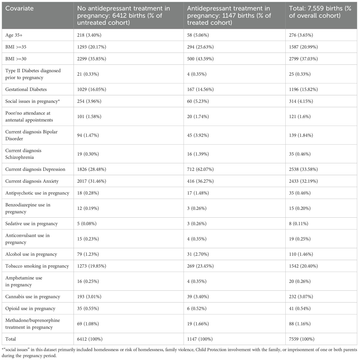 As mentioned, a cohort of women with a history of anxiety or depression, including postpartum depression, as well as women currently diagnosed with anxiety or depression during this pregnancy, was identified to account in part for unmeasured covariates such as genetic and lifestyle influences on outcomes. The total group of which treatment cohort and comparator group were comprised came to 7,559 births/episodes of care. Of this group, 6,412 babies were not exposed to antidepressants in pregnancy. 1,147 babies were exposed to antidepressants during this pregnancy. Please see Table 1: Descriptive statistics for depressed/anxious cohort for a comparison of various factors between the treatment and comparator group in this cohort.