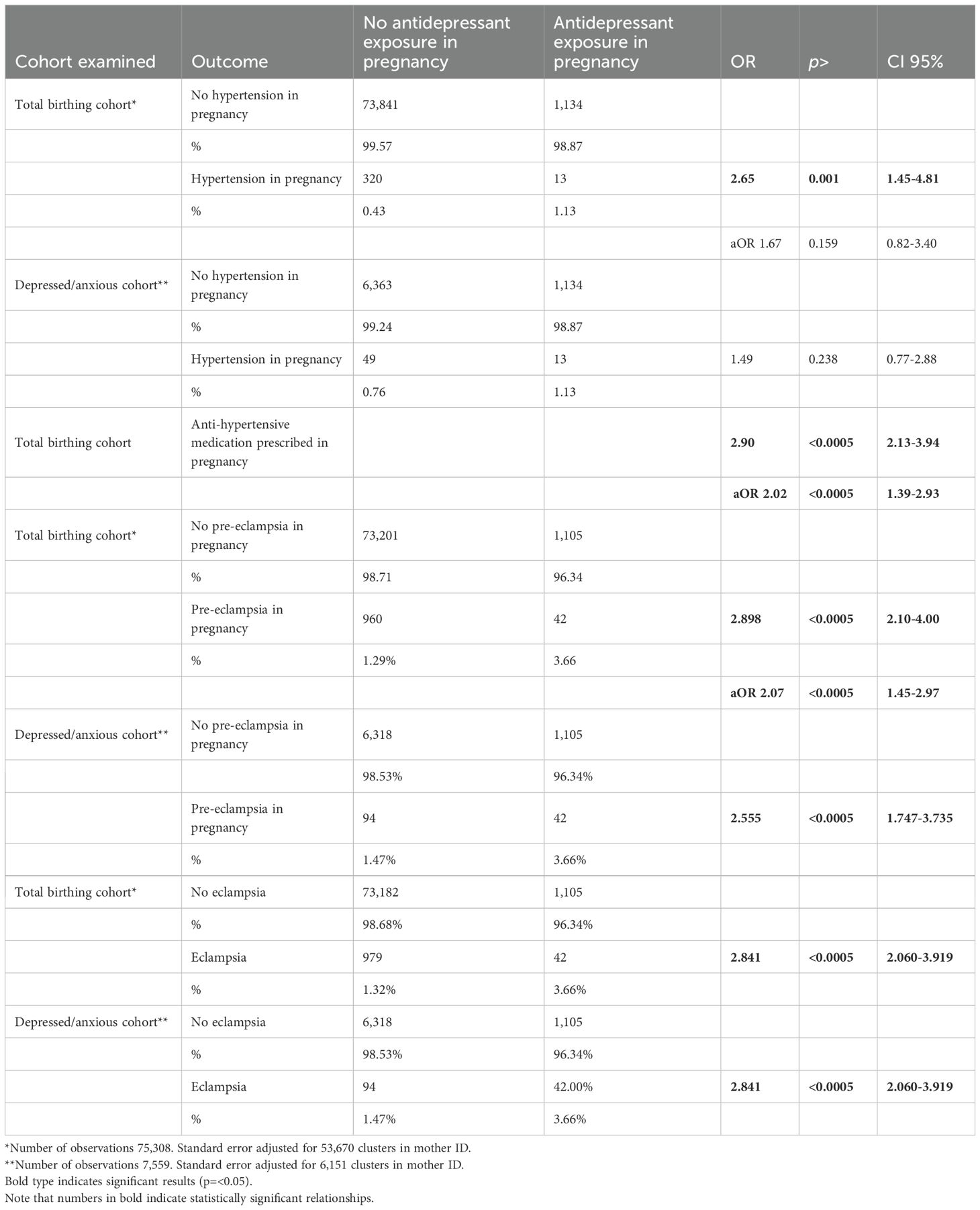 Table 2. Comparison of outcomes (hypertension in pregnancy, pre-eclampsia, eclampsia) for total birthing cohort and depressed/anxious cohort).