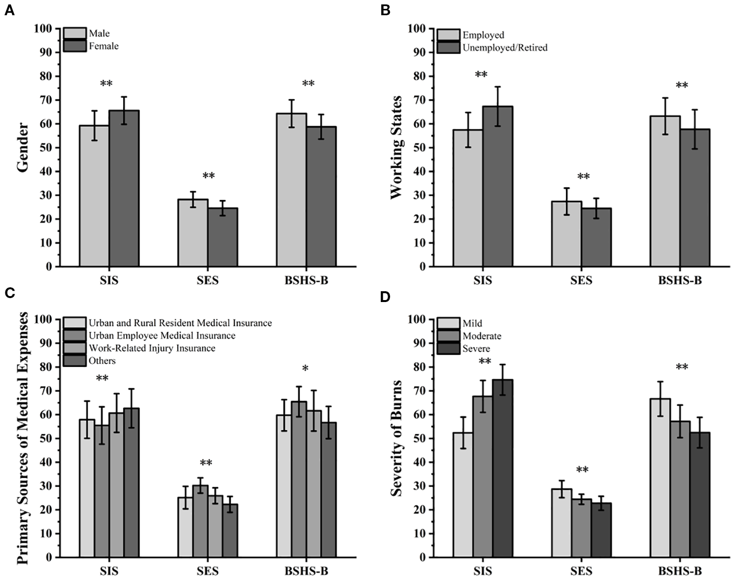 Differences in SIS, SES, and BSHS-B under different factors: (A) Different genders; (B) Different work status; (C) Different sources of medical expense coverage; (D) Different burn severity.**P<0.01, *P<0.05.
