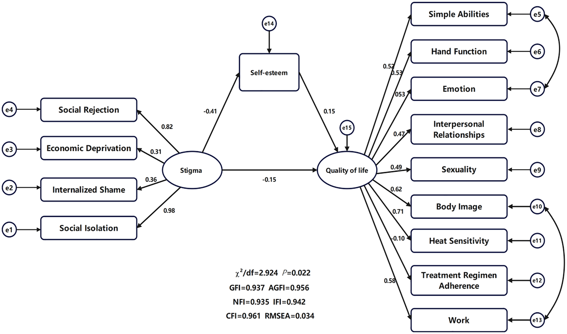 In this study, we chose self-esteem as a mediator rather than a moderator or predictor variable. The core rationale is based on social cognitive theory and self-determination theory. The former suggests that an individual’s cognitive processing of external evaluations, such as stigma, influences their self-concept (with self-esteem as a core dimension), which in turn shapes psychological experiences related to quality of life. The latter indicates that stigma undermines an individual’s sense of belonging and autonomy, leading to a decrease in self-esteem and weakening the perception of life’s meaning, ultimately reducing quality of life. As a mediator, self-esteem can reveal the path through which stigma influences quality of life via internal psychological resource depletion, whereas a moderator only explains changes in the strength of the relationship without clarifying the direct mechanism. Therefore, self-esteem is not suitable as a moderator.