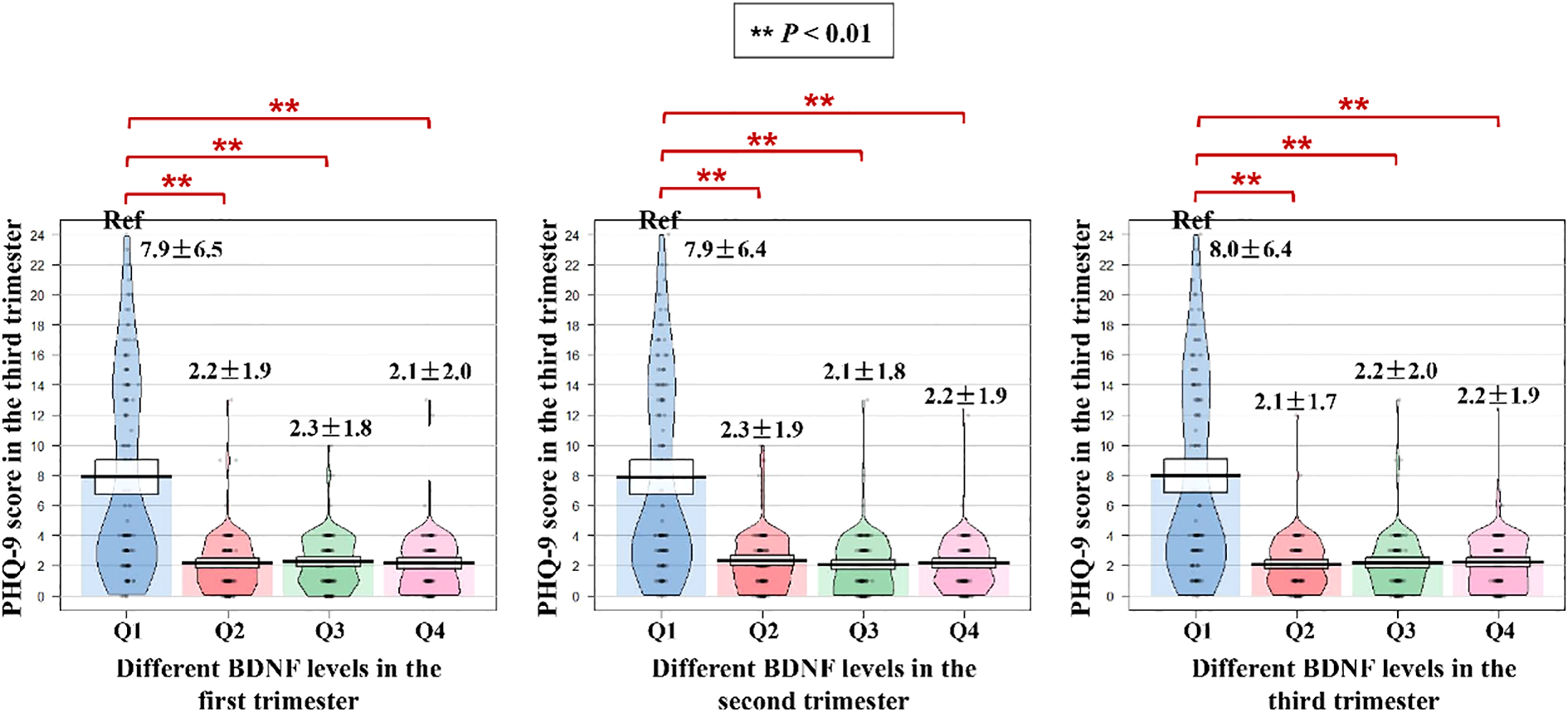 The distribution of PHQ-9 score in the third trimester among different BDNF levels groups is shown in Figure 2. Compared with the BDNF Q1 group in the first trimester, the PHQ-9 score in the third trimester was significantly lower in the Q2, Q3 and Q4 groups (Q1 vs. Q2 vs. Q3 vs. Q4 = 7.9 ± 6.5 points vs. 2.2 ± 1.9 points vs. 2.3 ± 1.8 points vs. 2.1 ± 2.0 points; all P-values < 0.01). Similarly, compared with the BDNF Q1 group in the second and third trimesters, the PHQ-9 score in the third trimester was significantly lower in the Q2, Q3 and Q4 groups (all P-values < 0.01).