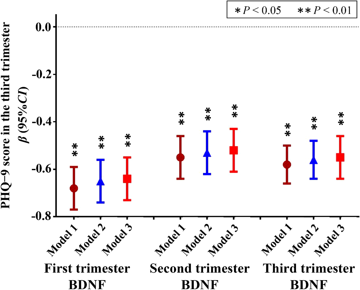 Univariable and multivariable linear regression analyses were conducted to assess the associations between BDNF levels in different trimesters and PHQ-9 score in the third trimester. In addition, binary and multivariable logistic regression models were used to evaluate the association between BDNF levels in different trimesters and depressive symptoms in the third trimester. The β, odds ratio (OR), and 95% confidence interval (CI) were reported. Three models were fitted in multivariable linear regression analyses and logistic regression analyses: model 1 was unadjusted; model 2 was adjusted for the first trimester age, marital status, household economic conditions, educational level, body mass index, sleep duration, physical activity, and occupations; model 3 was additionally adjusted for the first trimester PHQ-9 score. All analyses were completed using SPSS (version 27.0, Chicago, USA).