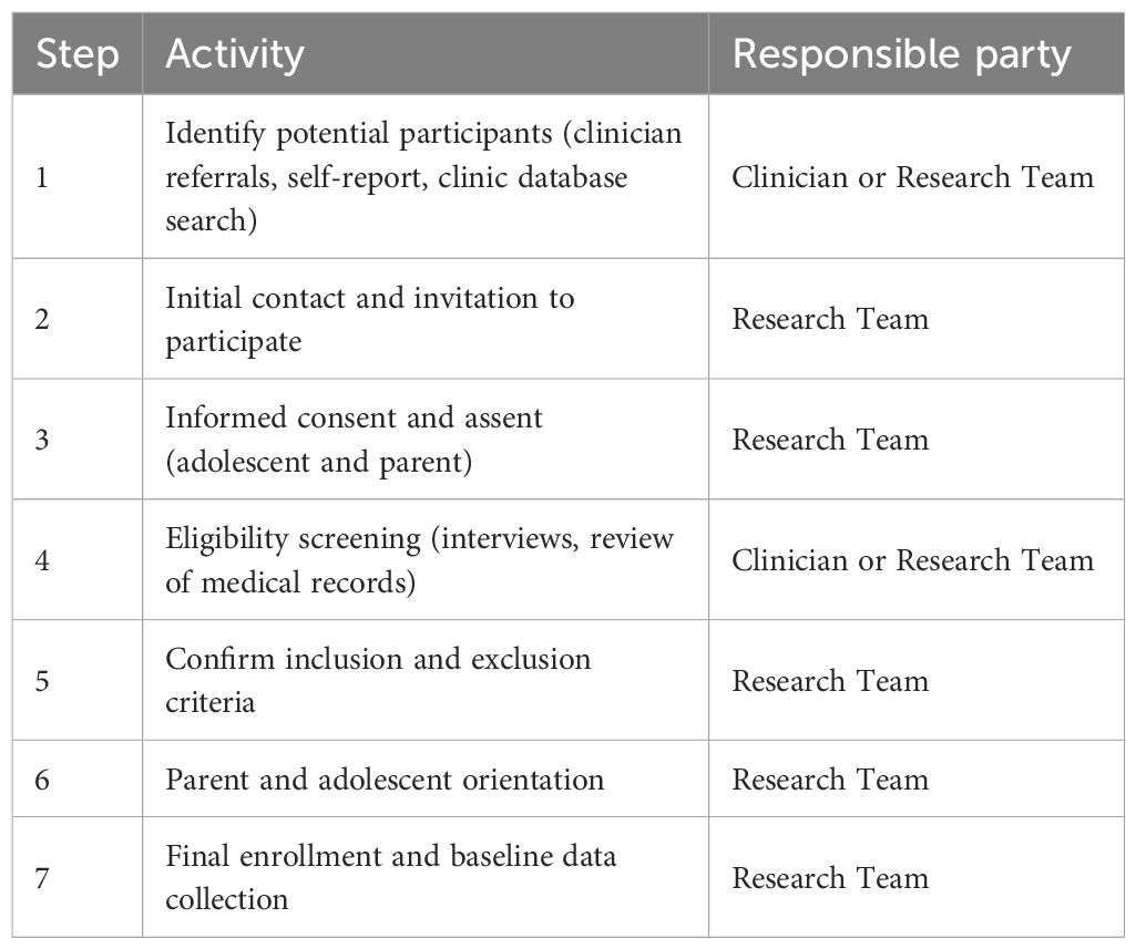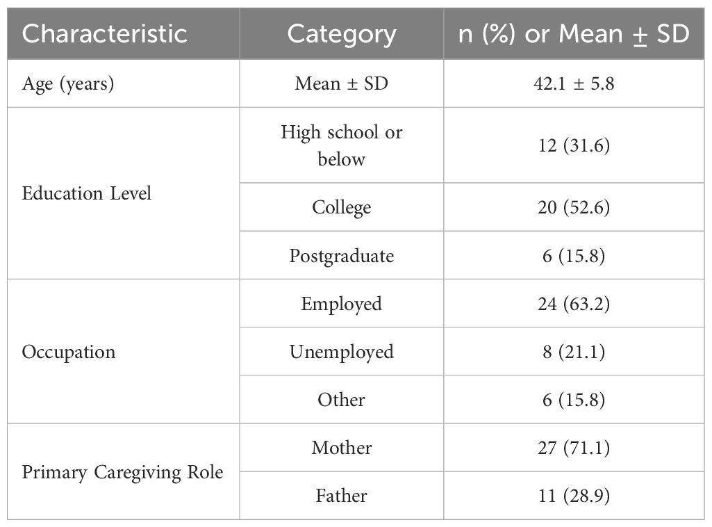 A total of 38 adolescent patients (9 males, 29 females; mean age 15.63 ± 2.58 years) met eligibility requirements. For each adolescent, one parent participated (mother: n=27, father: n=11). The mean age of participating parents was 42.1 ± 5.8 years. Demographic information about the participating parents — including age, educational attainment, occupation, and primary caregiving role — was collected and is presented in Table 1. The sample screening procedure is outlined in Table 2. Informed consent and assent were obtained, with both the adolescents (via assent) and their parents or guardians (via consent) signing forms to confirm their understanding and willingness to participate in the study.