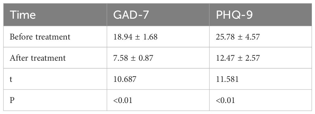 Following the intervention, both anxiety and depression scores in adolescents showed statistically significant reductions (Table 3). The mean GAD-7 score decreased from 18.94 ± 1.68 to 7.58 ± 0.87(t=10.687, P<0.01), corresponding to a large effect size (Cohen’s d ≈8.1), suggesting a substantial improvement in anxiety symptoms. Similarly, PHQ-9 scores decreased from 25.78 ± 4.57 to 12.47 ± 2.57 (t =11.581, P<0.01), also reflecting a large effect size (Cohen’s d ≈ 3.5).