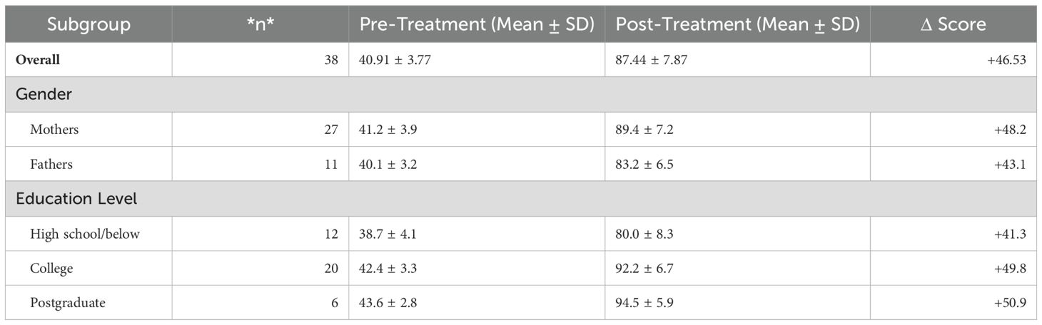 Exploratory subgroup analysis revealed noteworthy trends in parental resilience outcomes: mothers demonstrated greater resilience gains than fathers (Δ +48.2 vs. +43.1), while improvements positively correlated with education level (high school/below: Δ +41.3; college: Δ +49.8; postgraduate: Δ +50.9), suggesting advanced education may facilitate mastery of cognitive-intensive DBT skills (Table 4). However, these differences did not reach statistical significance (all P > 0.05) due to limited statistical power, and observed variations may reflect confounding factors including maternal overrepresentation (71%), unequal subgroup sizes, and unmeasured biological or cultural confounders such as stress reactivity and caregiving role expectations, thus warranting cautious interpretation as hypothesis-generating observations rather than definitive conclusions.