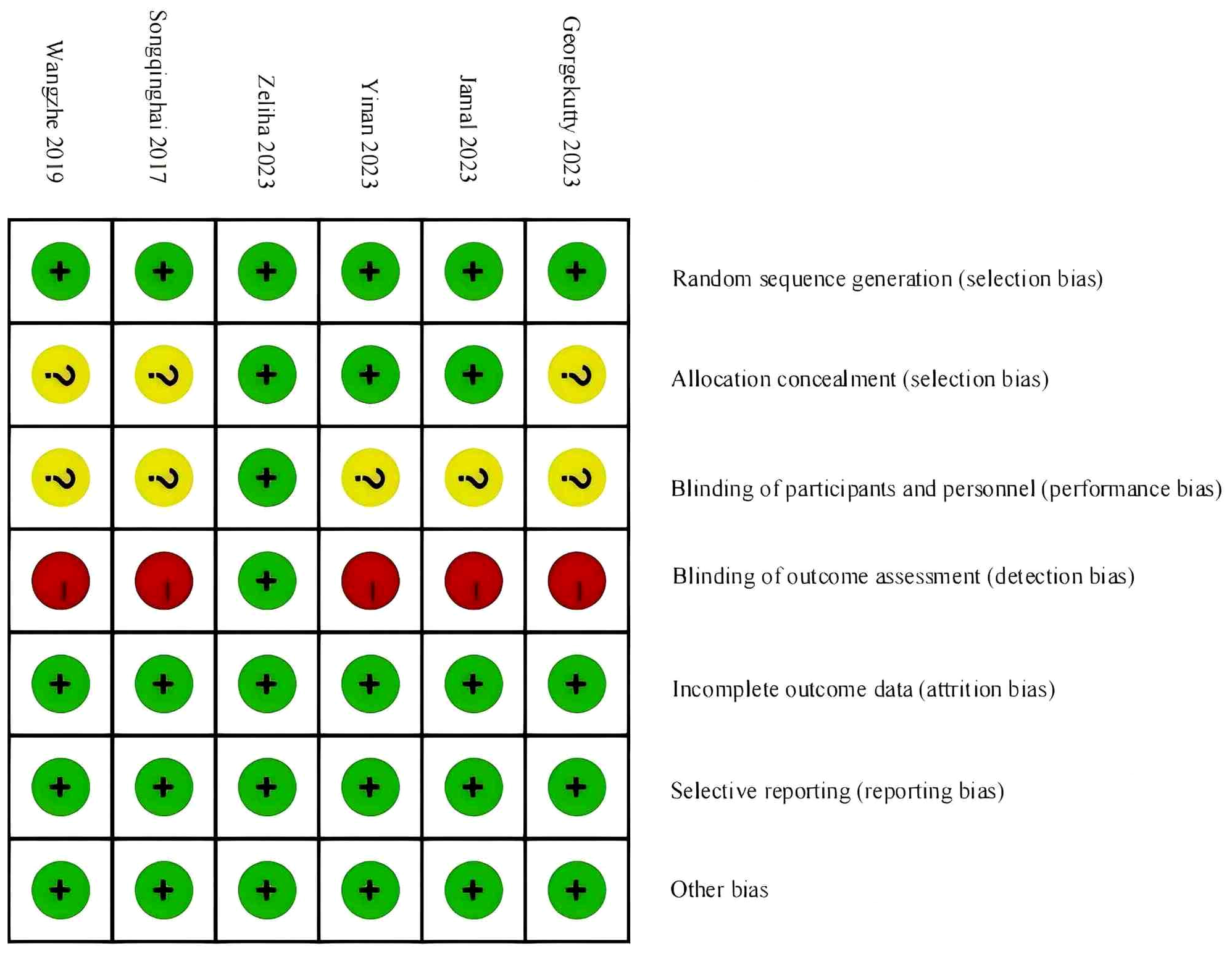 According to evidence-based medicine guidelines, the Cochrane systematic review "Risk of Bias" assessment tool was employed to evaluate the quality of the included studies across six domains: random sequence generation, allocation concealment, blinding, completeness of outcome data, selective reporting of results, and other sources of bias (34). During the statistical analysis, quality assessments were classified as follows: five or more items indicated a low risk of bias; three to four items indicated a moderate risk of bias; and fewer than three items indicated a high risk of bias.