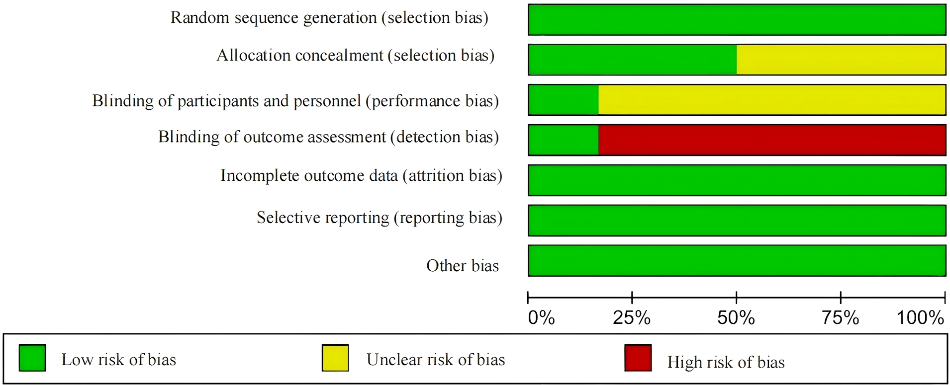 According to the Cochrane Risk of Bias Assessment Tool, the quality of the six included studies was evaluated. Among them, three studies were assessed as having a low risk of bias, and three studies were assessed as having a moderate risk of bias. See Figure 2. A statistical chart of the proportion of each item is shown in Figure 3.