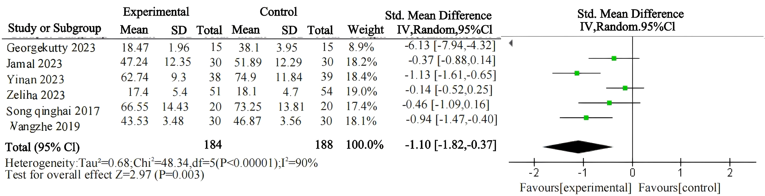 | random effects model | 6 | 48.34 | P<0.001 | 90% | 2.97 | P=0.003 | -1.10 (-1.82,-0.37) |