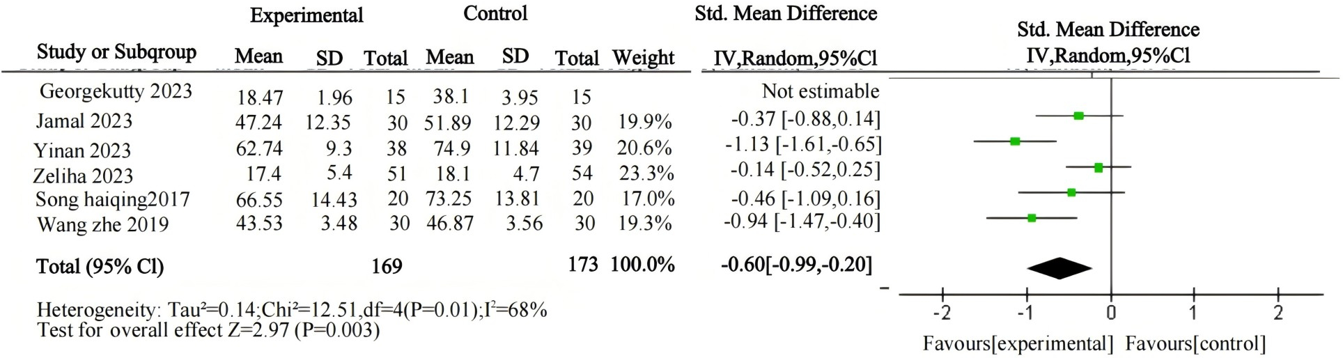| random effects model | 5 | 12.51 | P=0.01 | 68% | 2.97 | P=0.003 | -0.60 (-0.99,-0.20) |