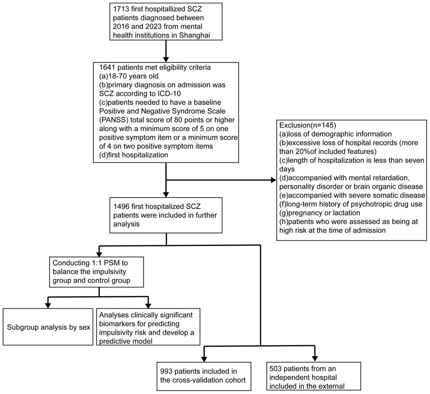 In China, the Impulsive Behavior Risk Assessment Scale (IBRAS) (8), a composite of the Modified Overt Aggression Scale and Impulsivity Screening-10, is widely used to screen hospitalized patients with SCZ. While it facilitates risk identification, its reliance on self-report and observer ratings may limit early proactive intervention (9). While tools like the IBRAS are widely adopted and clinically useful, they are primarily designed for contemporaneous risk monitoring during hospitalization, often failing to capture biological signals that precede overt behavioral escalation (10, 11). Developing a robust, data-driven prognostic model could overcome these limitations and support early, individualized intervention. However, most existing studies have focused on cross-sectional associations with current impulsivity (12, 13), rather than longitudinal prediction of future risk. Moreover, many are limited by small sample sizes, single-center designs (14), or insufficient control of confounding factors (15). Additionally, the association between sex and impulsivity in SCZ remains controversial, with studies reporting inconsistent findings (16, 17). Leveraging a large, multicenter real-world dataset, we employed propensity score matching (PSM) to control for confounding and reduce selection bias. This study aimed to elucidate the association between sex and future impulsivity in SCZ, evaluate the predictive value of routine biomarkers, and develop a clinically applicable risk model using machine learning. Early identification of impulsivity risk during the initial days of hospitalization can inform individualized treatment planning, proactive ward management, and preventive interventions (18). Such early warning systems may complement weekly clinical assessments (e.g., IBRAS) by identifying high-risk individuals prior to routine evaluations, offering timely insights that bridge the critical period immediately following admission, thereby potentially improving patient outcomes and ward safety (19).