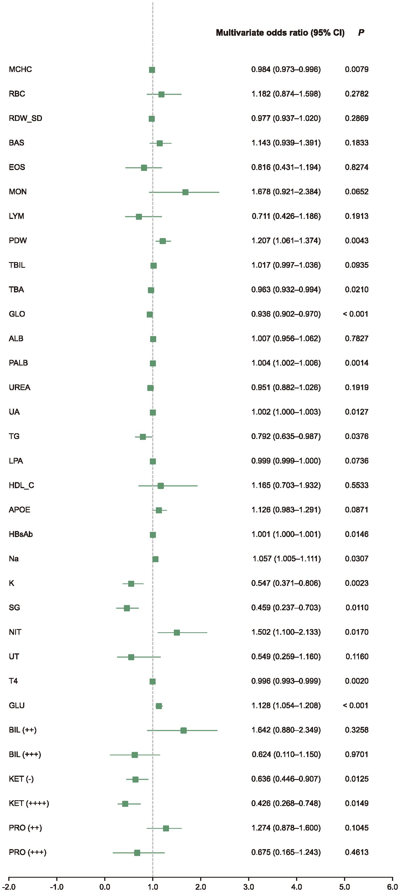 Subsequently, univariate and multivariate logistic regression analyses were performed on the selected biomarkers, identifying several with statistically significant associations with impulsivity (Supplementary Table S4). The high-risk indicators identified by ORs were mean platelet width (PDW), prealbumin (PALB), uric acid (UA), hepatitis B virus surface antibody (HBsAb), natrium (Na), urinary nitrite (NIT), fasting glucose (GLU), urine ketones (KET) negative; While the low-risk indicators included mean corpuscular hemoglobin concentration (MCHC), total bile acid (TBA), globulin (GLO), kalium (K), tetraiodothyronine (T4) (Figure 2).