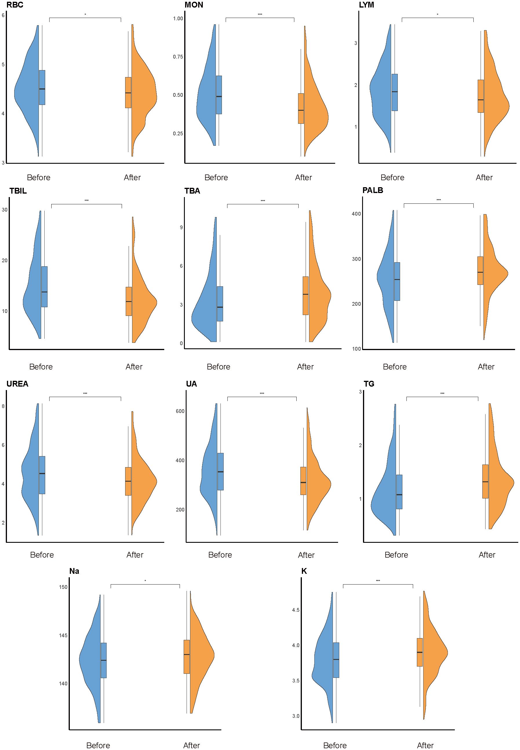 Figure 5. Subgroup time-trend analysis. Violin plots illustrate longitudinal changes in biomarker levels from within one week of admission (“before”) to 180 days after impulsivity escalation (“after”), stratified by sex. (a) Male subgroup. Significant temporal changes were observed in red blood cell count (RBC), monocytes (MON), total bilirubin (TBIL), prealbumin (PALB), uric acid (UA), triglycerides (TG), potassium (K), and urea (UREA). (b) Female subgroup. Significant variation was found in MON, TBIL, total bile acid (TBA), PALB, UA, TG, sodium (Na), and K. Notably, MON, TBIL, PALB, UA, TG, and K exhibited consistent time-dependent changes in both sexes. Statistical comparisons were conducted using paired Welch’s t-tests; *P < 0.05, **P < 0.01, ***P < 0.001. Box plots indicate medians and interquartile ranges.