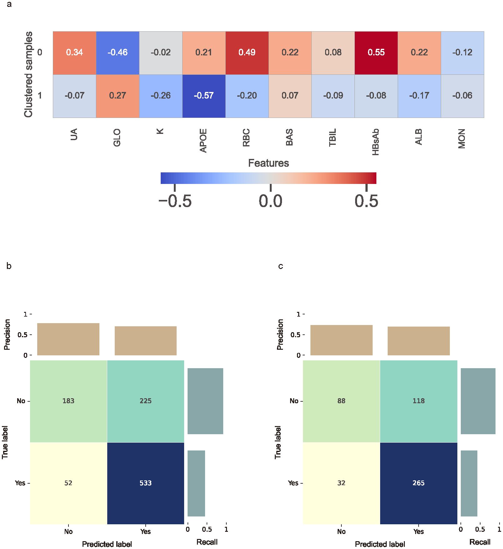 Figure 6. Clustered SHAP values heatmap and the confusion matrix. (a) Clustered SHAP (Shapley Additive Explanations) heatmap showing distinct feature attribution patterns across patient subgroups, based on top 10 biomarkers. Clustering was performed using K-means based on individual SHAP value profiles. Color intensity reflects mean SHAP values per biomarker within each cluster, with red indicating increased predicted risk and blue indicating reduced contribution. (b) Confusion matrix for the cross-validation cohort. (c) Confusion matrix for the external testing cohort. Confusion matrices present true and predicted labels for impulsivity, with darker cells representing higher counts.