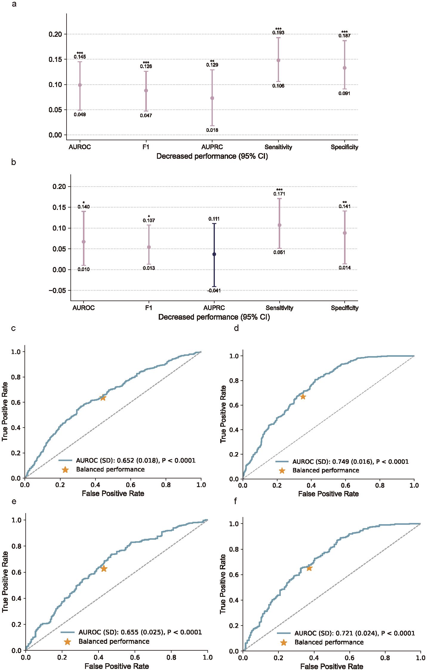 Figure 7. Added benefits of biomarker measurements and the receiver operating characteristic curves (ROC). (a) Performance gain from incorporating biomarker features in the cross-validation cohort, assessed using AUROC, F1 score, AUPRC, sensitivity, and specificity. (b) Performance gain in the external testing cohort. Bars indicate absolute differences in model performance between models with and without biomarkers, with 95% confidence intervals. P values were calculated using Nadeau and Bengio’s corrected resampled t-test; *P < 0.05, **P < 0.01, ***P < 0.001. (c–f), Receiver operating characteristic (ROC) curves comparing models without (c, e) and with (d, f) biomarker inputs in the cross-validation cohort (c, d) and external testing cohort (e, f). Inclusion of biomarkers substantially improved model discrimination, as indicated by increased AUROC values and more favorable balance points.