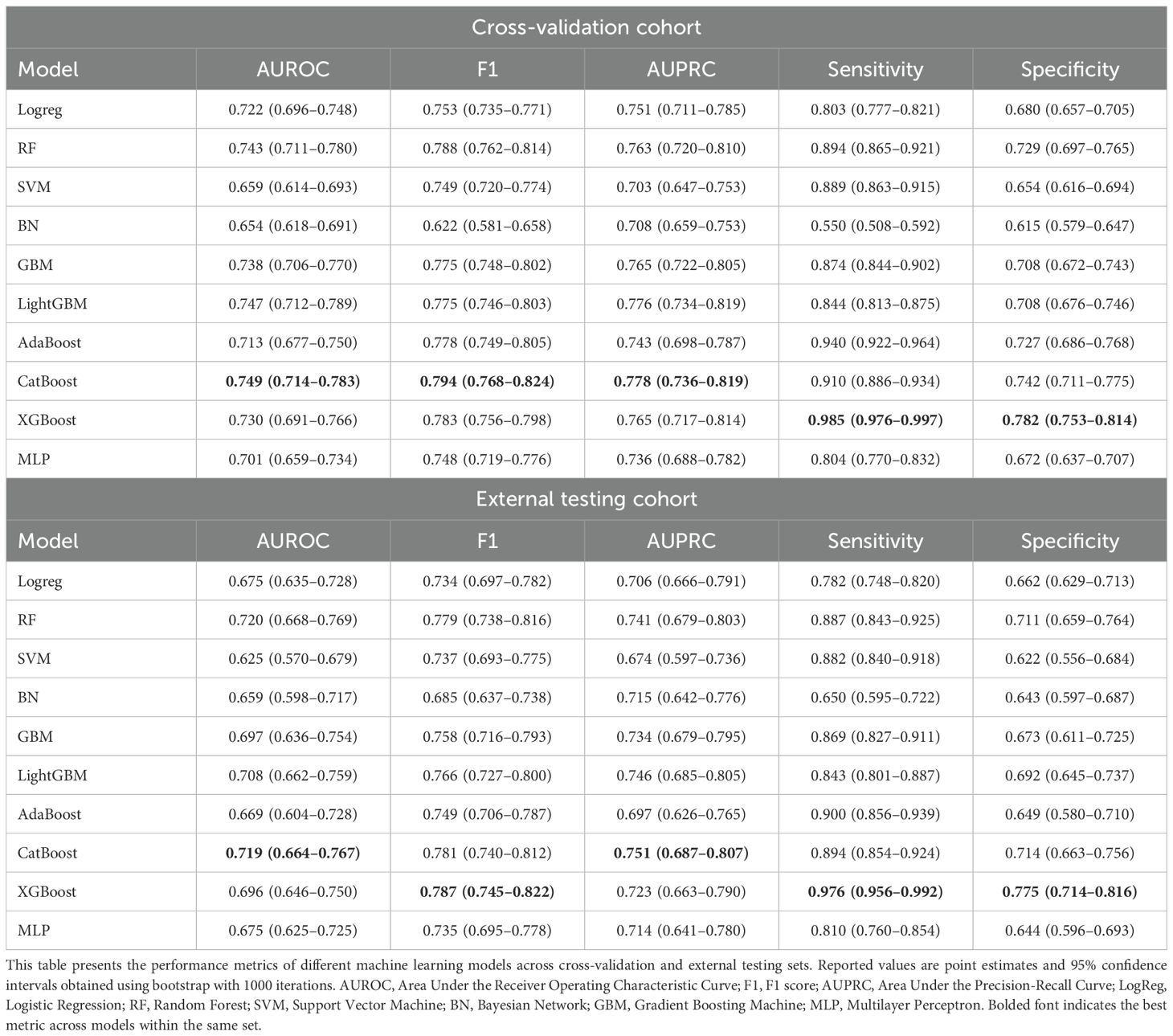 CatBoost outperformed other models in both the cross-validation and external testing cohorts, achieving the highest AUROC of 0.749 (95% CI 0.714–0.783) and 0.719 (95% CI 0.664–0.767), respectively. It also showed superior F1 scores (0.794, 95% CI 0.768–0.824) and sensitivity (0.910, 95% CI 0.886–0.934), demonstrating its robust predictive performance across cohorts (Table 1, Figures 6B, C).
