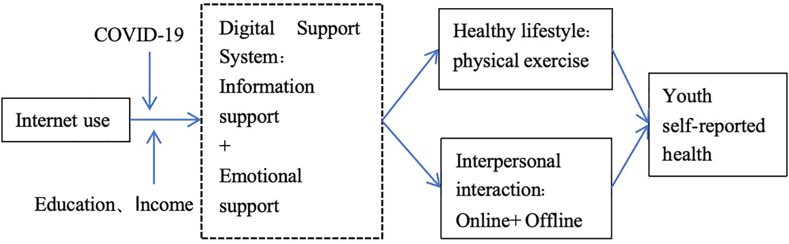 Domestic and international research on the relationship between the Internet and health has broadly developed a dichotomous view. The health promotion theory holds that Internet use has a significant positive effect on the health of individuals (1, 2),and brings health benefits by narrowing the digital divide (3). While the health inhibition theory suggests that Internet addiction is a significant factor in the health inhibition of Internet technology. Prolonged Internet entertainment can negatively affect health by decreasing interpersonal interaction and increasing loneliness and thus. Excessive use of the Internet, as well as reliance on online social media, both increase the health risks of Internet users (4). In recent years, there are also many studies related to the impact of the Internet on health, but in general there are still the following shortcomings: first, in terms of the research object, most of the established studies have focused on the elderly (5–7), rural groups (8), less attention is paid to urban youth groups. While contemporary youth have generally realized Internet access, their lifestyles and interpersonal interactions are highly dependent on Internet use, so it is of great practical significance to pay attention to the impact of Internet use on self-reported health among urban and rural youths. Second, existing studies have not yet placed the analysis of the mechanism of the Internet’s influence on youth self-reported health in the particular scenario of COVID-19. For example, some scholars believe that the leisure and entertainment functions of social use of Internet have a positive impact on the enhancement of youth mental health (9). The “hyper-network” characterization of digital technology expands the boundaries of interpersonal interaction (10); the “clustered” characterization (11) of Internet communication has a positive effect on mental health through social support. At the same time, some scholars have suggested that Internet use has a “double-edged sword effect” on youth health, and have included the mediating factors of social network as well as health management in the explanatory framework of “technology-health” (12). However, none of the above studies considered whether the impact of COVID-19 on the support of interpersonal interactions and healthy lifestyles of youth had changed. Because for the youth group who have already adapted to the fast-paced life, the sudden COVID-19 seems to press the pause button in the rapid development stage, and the youth’s life pattern and interaction mode will inevitably be affected. As Internet is the primary medium through which youth engage with the outside, it is more relevant to discuss its impact on youth's self-reported health during COVID-19.