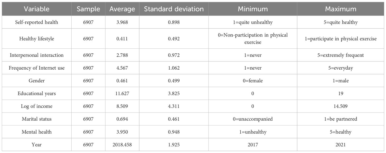 Based on the age definition of youth, only the 18-45 cohort is retained in this paper. In the income sample, in order to avoid the influence of extreme values, income above the millionth percentile and missing values of “not applicable”, “don't know”, and “refused to answer” were deleted. In the Internet use, self-assessed health, and mental health samples, missing values for “don't know” and “refused to answer” were removed. The dependent variables in this study measured healthy lifestyle, interpersonal interaction and self-reported health.