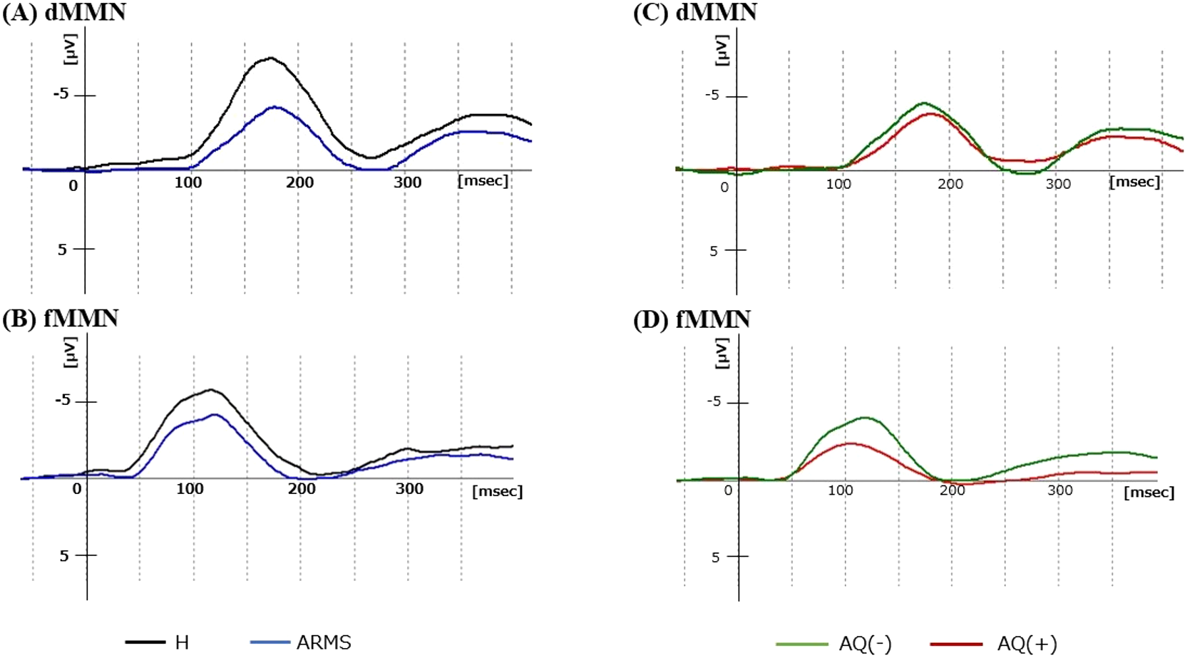 Figure 1. Grand average dMMN and fMMN waveforms at Fz. (A, B) show the dMMN and fMMN waveforms of the H (black) and ARMS (blue) groups. (C, D) show the dMMN and fMMN waveforms of the AQ(-) (green) and AQ(+) (red) ARMS subgroups. ARMS, at-risk mental state; AQ, Autism -Spectrum Quotient; dMMN, duration mismatch negativity; fMMN, frequency mismatch negativity; H, healthy controls.