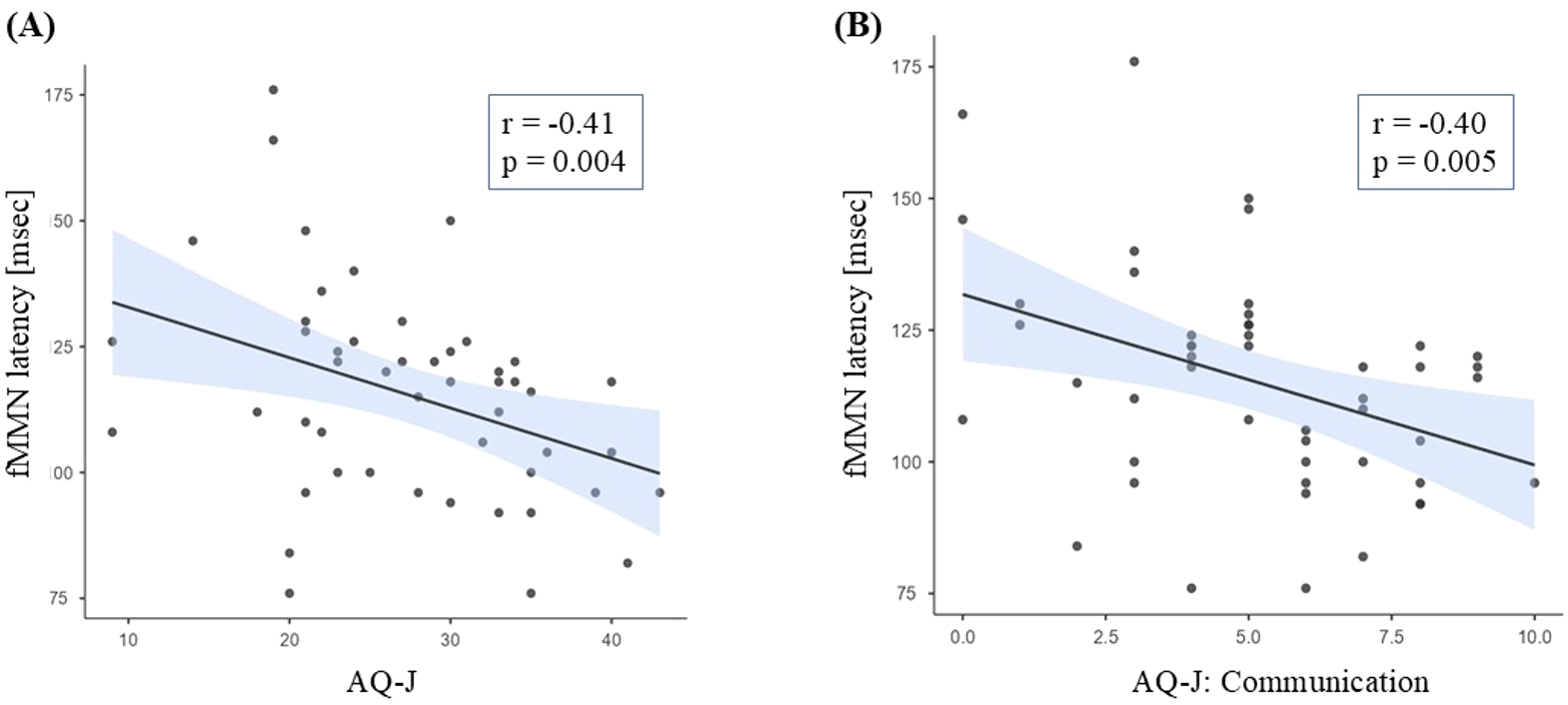 We then investigated the correlations between the fMMN latency and each AQ-J subscale score; the fMMN latency showed a significant negative correlation with the Communication subscale (r=-0.40, p=0.005) (Figure 2B, Supplementary Table 8). Imagination was also correlated with fMMN latency, but it did not remain significant after the Bonferroni correction.