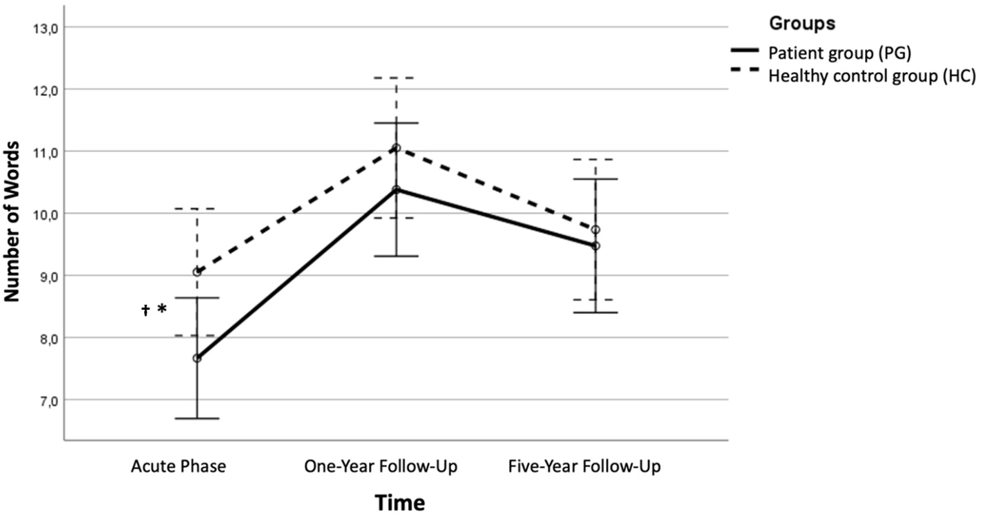 The mixed between-within subjects analysis of variance with three time points showed no significant effect between groups, Λ = .93, F (2, 37) = 1.20, p = .313, η2 = .06. There was a significant main effect of time, Λ = .48, F(2, 37) = 19.89, p <.001, η2 = .52, indicating a large effect, showing that across time there was a significant improvement in scores for both groups (see Figure 2). An independent samples t-test showed that the change score from Y0 to Y5 for the PG (M = 2.0, SD = 2.44) did not reach statistical significance compared to HC(M = 0.68, SD = 2.47), t(39) = 1.71, p = .096 (two-tailed). The mean score difference was 1.32, 95% CI [-0.24, 2.87], with a medium effect size η2 = .07. A paired-samples t-test showed that the PG had a significant improvement from Y0 (M = 7.59, SD = 1.79) to Y5 (M = 9.59, SD = 2.30), t(21) = -3.83, p <.001 (two-tailed). This finding was also significant when adjusting for multiple comparisons (Bonferroni correction p <.007). The mean increase in scores on the immediate free recall trial 1 condition was 2.0, 95% CI [-1.29, 3.68], η2 = .41, indicating a large effect. For the HC, a paired-samples t-test showed that there was no significant change in scores from Y0 (M = 9.05, SD = 2.57) to Y5 (M = 9.74, SD = 2.58), t(18) = -1.21, p = .243 (two-tailed). The mean increase in scores on the immediate free recall trial 1 condition was 0.68, 95% CI [-0.73, 0.19], η2 = .07.