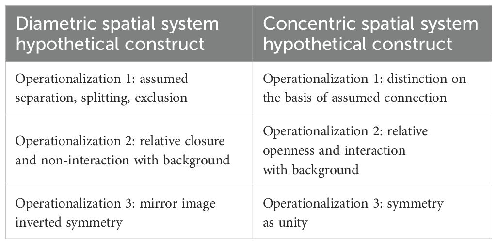 The interpretative spatial methodology in this article builds on a synthesis of a range of research traditions. In cognitive psychology and linguistics, conceptual metaphors and image schemas are uncovered in terms of background and foreground spatial understandings framing and shaping language, consistent with specific structures (51, 52). Another interpretative paradigm interrogating spatial background assumptions is Ricoeur’s hermeneutics (2, 37), where he is treated as offering a spatial turn for hermeneutics (38), including through spatially imbued fundamental terms such as distantiation and belonging (23, 30). Again, spatial structural dimensions here are argued at the level of consistency with spatial patterns and at the level of framing assumptions. Beyond cognitive psychology, linguistics, and hermeneutics, a further layer for this spatial questioning emerges from the structuralist anthropology of Lévi-Strauss. Here, Lévi-Strauss goes further to focus on contrasting spatial alternatives, such as concentric and diametric spaces, as spatial systems of meaning that are both explicitly manifested as physical structures and at a background level of interpretation in terms of social structures and myths (4, 47).