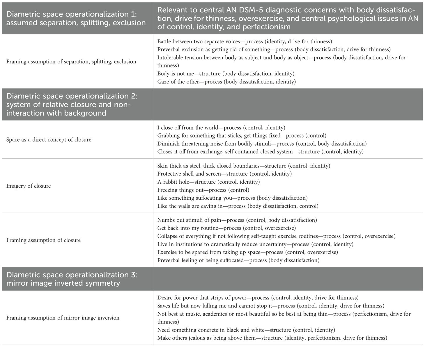 Participants viewed the anorexic thoughts as external (or alien) to the thoughts of their self. Their disorder was perceived as a separate entity that “took over” and “consumed” the person’s life and identity and made it difficult to escape [ (12), p. 807]. Diametric space is a process and structure of splitting of the self into a self in opposition to an alien other within. A different study of AN gave a similar finding where the body-as-object is not simply experienced as some inert object but has its own “voice” [ (11), p. 48].