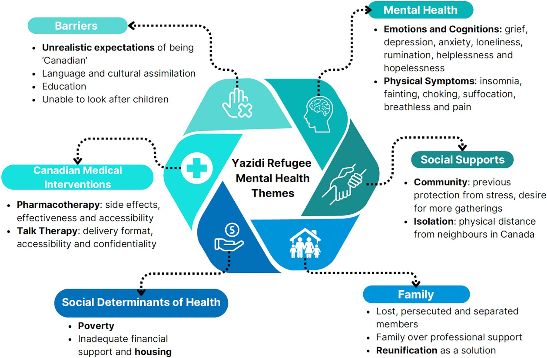 Six themes regarding Yazidi experiences with mental health, their preferred coping mechanisms and barriers to care were identified: Mental Health, Family, Canadian Medical Interventions, Social Supports, Social Determinants of Health and Barriers (see Figure 1).