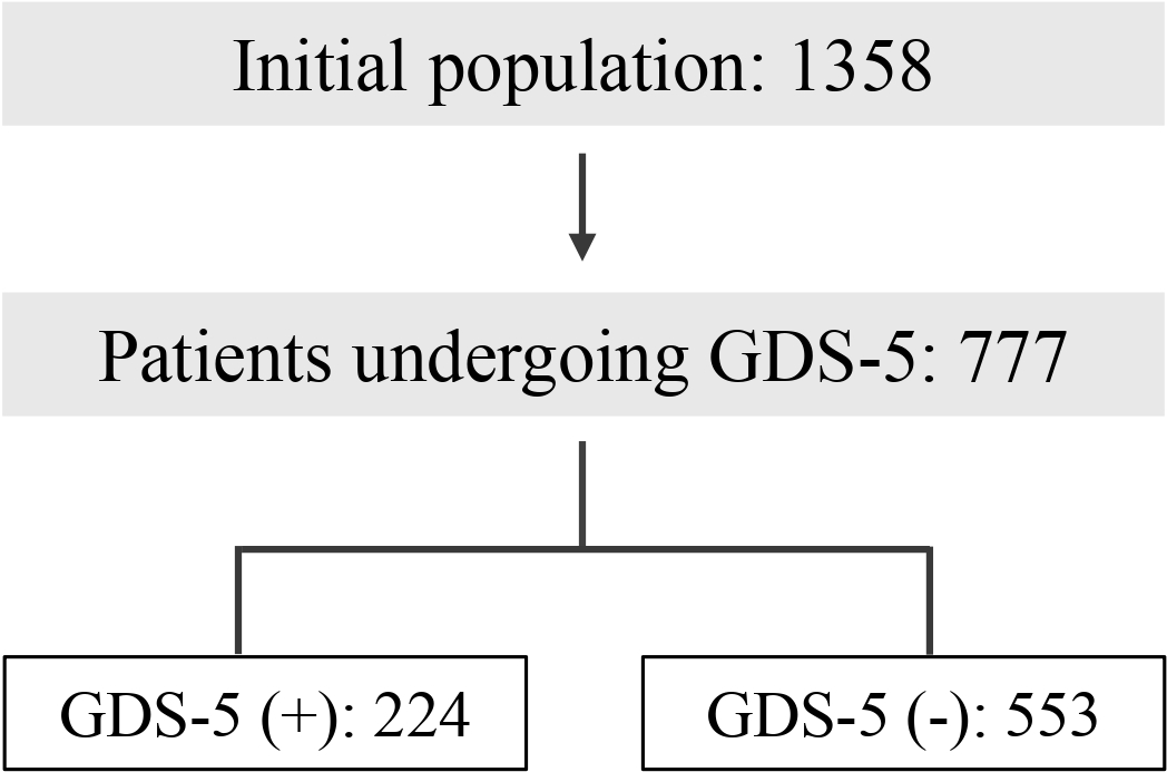 Among the 777 patients who underwent the GDS5 test, 224 obtained a score within the range indicating a risk of depression, while 553 did not.