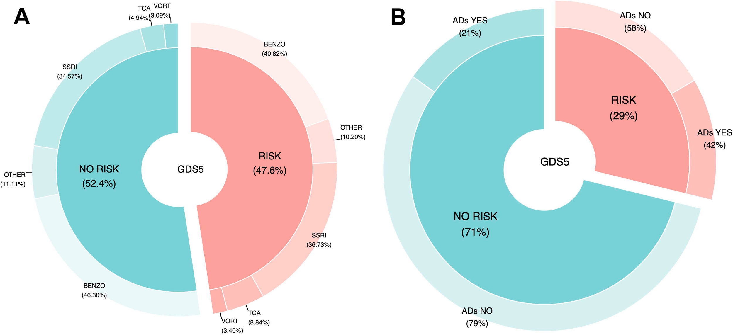 A descriptive analysis was carried out to compare the different variables between patients with GDS5 risk and patients without GDS5 risk. Categorical variables were compared by the Pearson’s Chi-squared test or the nonparametric alternative through Fisher’s exact test when appropriate. They were depicted by percentages. Numerical variables were represented through mean and standard deviation and compared with two-sample t-tests after testing compliance with the assumptions of normality (Shapiro-Wilk test) and homogeneity of variance (Levene’s test). An equivalent non-parametric alternative to the t-test was employed if such assumptions were not met. In that sense, the Wilcoxon rank-sum method was used. All tests were two-tailed, and a p-value < 0.05 indicated statistical significance. In Appendix II, a logistic regression model adjusted by age and sex has been calculated to reinforce the discoveries of the statistical tests. Moreover, this study is an exploratory rather than a confirmatory study that aims to discover new working hypotheses on the relationship between antidepressant treatment and dementia. Then, we did not adjust p-values for multiple comparisons given the descriptive nature of this epidemiologic study, in line with existing recommendations (41).