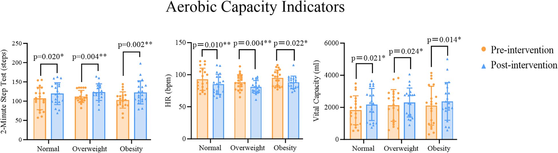Paired sample t-tests were used to analyze changes in aerobic capacity indicators across the three groups of participants. Compared with the pre-test within the same group, the post-test performance showed significant differences for the 2-minute step test in the Normal (t=-2.548, p=0.020), Overweight (t=-3.230, p=0.004), and Obesity (t=-3.559, p=0.002) Groups. For HR, there were also significant differences in the Normal (t=2.848, p=0.010), Overweight (t=3.204, p=0.004), and Obesity (t=2.484, p=0.022) Groups between the pre- and post-test performances. Similarly for vital capacity, significant differences were found in the Normal (t=-2.506, p=0.021), Overweight (t=-2.452, p=0.024), and Obesity (t=-2.707, p=0.014) Groups between the pre- and post-test performances (Figure 2).