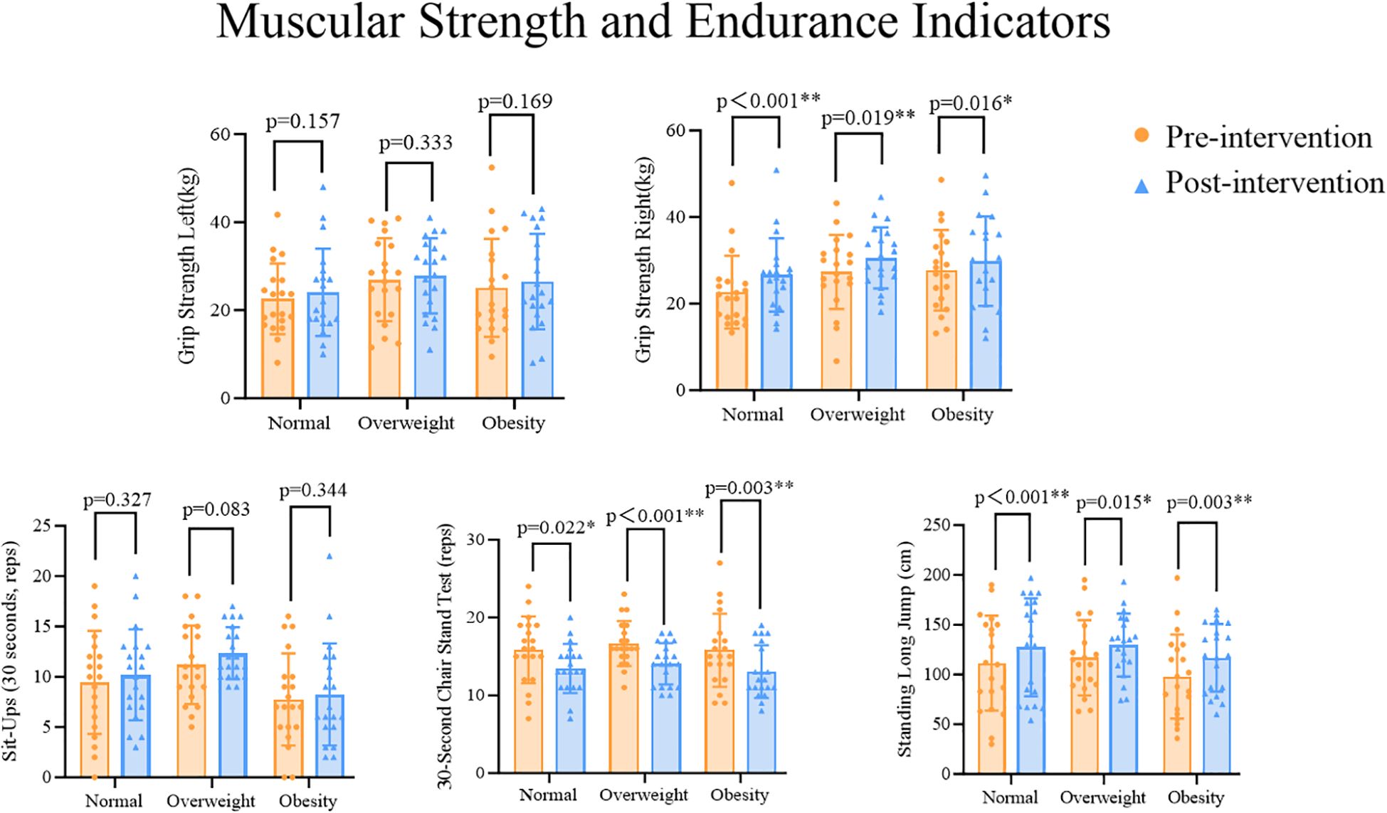 Paired sample t-tests were used to analyze changes in muscle strength and endurance indicators across the three groups of participants. The results showed that compared with the pre-test performances within the same group, there were no significant differences in the post-test performances for left-hand grip strength in the Normal (t=-1.472, p=0.157), Overweight (t=-0.993, p=0.333), or Obesity (t=-1.431, p=0.169) Groups. By contrast, for right-hand grip strength, significant differences were found between the pre- and post-test performances for the Normal (t=-3.983, p=0.001), Overweight (t=-2.560, p=0.019), and Obesity (t=-2.641, p=0.016) Groups. For the standing long jump, significant differences were also found in the post-test performances compared with the pre-test performances for the Normal (t=-3.976, p=0.001), Overweight (t=-2.678, p=0.015), and Obesity (t=-3.368, p=0.003) Groups. For the sit-up indicator, there were no significant differences in the post-test performances for the Normal (t=-1.005, p=0.327), Overweight (t=-1.827, p=0.083), and Obesity (t=-0.970, p=0.344) Groups. For the sit-to-stand indicator, significant differences were found in the post-test performances for the Normal (t=-3.983, p=0.012), Overweight (t=3.939, p=0.001), and Obesity (t=3.477, p=0.003) Groups (Figure 3).