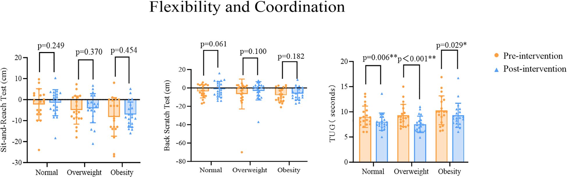 Paired sample t-tests were used to analyze changes in flexibility and coordination indicators across the three groups of participants. The results showed that compared with the pre-test performance within the same group, there were no significant differences in the post-test performance in the sit and reach test for the Normal (t=-1.189, p=0.249), Overweight (t=-0.918, p=0.370), and Obesity (t=-0.765, p=0.454) Groups. For the back scratch test, there were no significant differences in the post-test performances for the Normal (t=-1.992, p=0.061), Overweight (t=-1.728, p=0.100), or Obesity (t=-1.386, p=0.182) Groups compared with the pre-test performances. By contrast, for the TUG test, significant differences were found in the post-test performances for the Normal (t=3.071, p=0.006), Overweight (t=3.955, p=0.001), and Obesity (t=2.369, p=0.029) Groups (Figure 4).