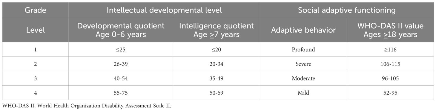 Intellectual disability (ID) is a highly heterogeneous neurodevelopmental disorder characterized by significant limitations in intellectual functioning and adaptive behavior (1, 2), typically occurring before 18 years of age (3). Based on the severity of functional impairment, ID is classified into four levels: mild, moderate, severe, and profound (see Table 1) (4).
