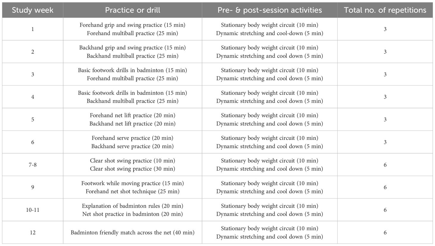 A 12-week badminton training program was conducted with two sessions per week, and data analysis was performed to evaluate the impact of badminton training on the health and physical fitness of adults with mild to moderate ID. The exercise plan that participants followed is shown in Table 3.