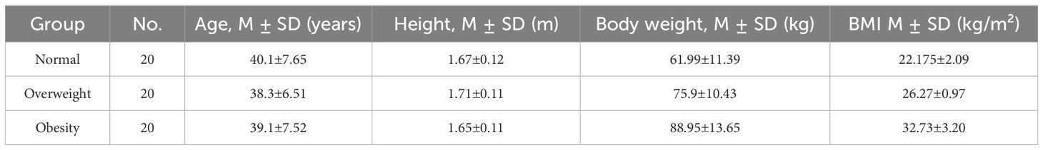 This study recruited 82 adults with ID who met the criteria. A total of 22 people withdrew or were absent from one-third of the intervention due to health or personal reasons and were, therefore, excluded from the analysis. In total, 60 adults 25–45 years of age with mild to moderate ID were included in the experimental analysis (39 male and 21 female; 55 participants right-hand dominant, and 5 left-hand dominant). In order to reduce measurement bias in the experiment, the testers were unaware of group allocations during the experiment. Prior to group allocation, participants were grouped based on observational information from their pre-test BMI to prevent them from being randomly assigned to BMI groups during the intervention. Figure 1 shows the details for participant screening, group allocation, and analysis through the study, and the participants’ basic characteristics are shown in Table 2. Eligible participants were assigned to one of three groups based on their BMI category: Normal (BMI: 18.5–24.99 kg/m²), Overweight (BMI: 25.0–29.9 kg/m²), and Obesity (BMI ≥30.0 kg/m²) (20).