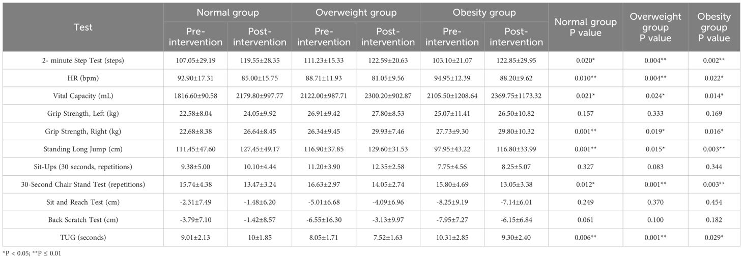 Table 4. Differences in health-related physical fitness metrics before vs after the badminton intervention in normal, overweight, and obesity groups.