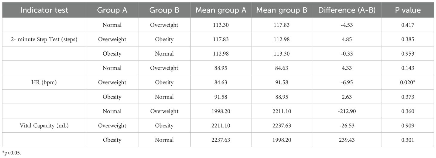 Multivariate analysis of variance (MANOVA) results showed that there were significant differences in some aerobic capacity indicators between different BMI groups when comparing pre- and post-test performances. Further post-hoc comparisons (LSD) revealed no significant differences in the changed performances for the 2-minute step test between the groups (Normal vs Overweight: p=0.417; Normal vs Obesity: p=0.953; Overweight vs Obesity: p=0.385). The Obesity Group had lower pre- and post-test performances on the 2-minute step test than the Normal Group, and the Normal Group had lower performances on the 2-minute step test than the Overweight Group. For HR as an indicator of cardiovascular health, there were no significant differences in the changed performances between the Normal Group and the Overweight Group or the Obesity Group (Normal vs Overweight: p=0.143; Normal vs Obesity: p=0.373), but there was a significant difference in the changed performances between the Overweight and Obesity Groups (p=0.020). The Overweight Group had lower pre- and post-test performances on resting HR than the Normal Group, and the Normal Group had lower performances on resting HR than the Obesity Group, with the Obesity Group significantly higher than the Overweight Group. For the vital capacity test, there were no significant differences in the changed performances between the groups (Normal vs Overweight: p=0.360; Normal vs Obesity: p=0.301; Overweight vs Obesity: p=0.909). The Normal Group had lower pre- and post-test performances on the vital capacity test than the Overweight Group, and the Overweight Group had lower performances on the vital capacity test than the Obesity Group (Table 5).