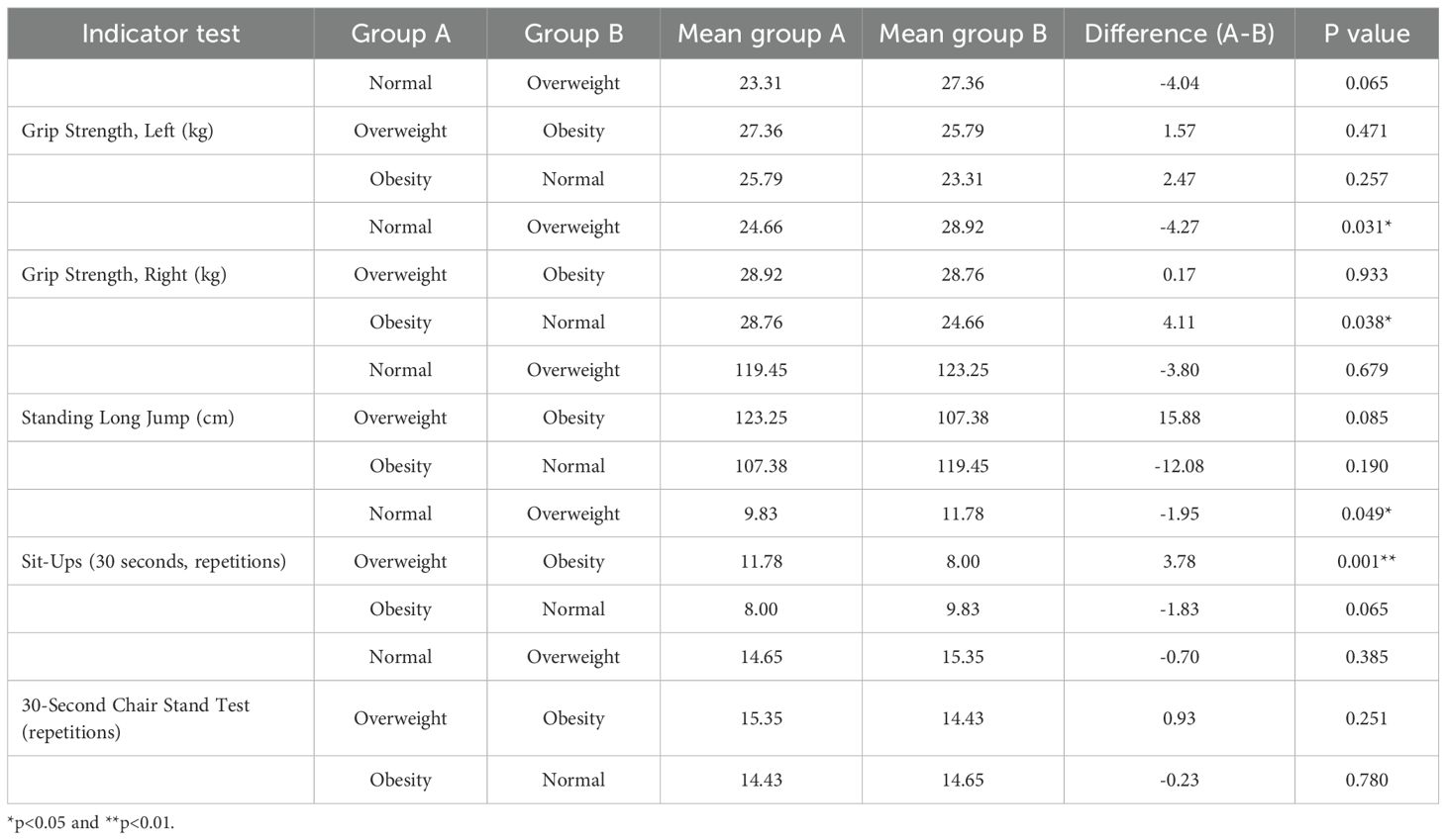 MANOVA results showed that there were significant differences in some muscle strength and endurance indicators between different BMI groups when comparing pre- and post-test performances. Further post-hoc comparisons (LSD) revealed the following results. For left-hand grip strength, there were no significant differences in the changed performances between the groups (Normal vs Overweight: p=0.065; Normal vs Obesity: p=0.257; Overweight vs Obesity: p=0.471). The Normal Group had lower performances on left-hand grip strength than the Obesity Group, and the Obesity Group had lower performances on left-hand grip strength than the Overweight Group. However, for right-hand grip strength, there were significant differences in the changed performances between the Normal and Overweight Groups, as well as between the Normal and Obesity Groups (Normal vs Overweight: p=0.031; Normal vs Obesity: p=0.038), but no significant difference was found between the Overweight and Obesity Groups (Overweight vs Obesity: p=0.933). The Normal Group had lower performances on right-hand grip strength than the Obesity Group, and the Obesity Group had lower performances on right-hand grip strength than the Overweight Group, with the Normal Group performances on right-hand grip strength significantly lower than both the Overweight and Obesity Group performances. For the standing long jump indicator, there were no significant differences in the changed performances between the groups (Normal vs Overweight: p=0.679; Normal vs Obesity: p=0.190; Overweight vs Obesity: p=0.085). The Obesity Group had lower performances on the standing long jump indicator than both the Normal and Overweight Groups. For the sit-up indicator, there were significant differences in the changed performances between the Normal and Overweight Groups, as well as between the Overweight and Obesity Groups (Normal vs Overweight: p=0.049; Overweight vs Obesity: p=0.001). However, no significant difference was found between the Normal and Obesity Groups (Normal vs Obesity: p=0.065). The Normal Group had significantly higher performances on the sit-up indicator than the Overweight Group and the Overweight Group had higher performances on the this indicator than the Obesity Group, while the Obesity Group had the lowest performances on the sit-up indicator. For the sit-to-stand indicator, there were no significant differences in the changed performances between the groups (Normal vs Overweight: p=0.385; Normal vs Obesity: p=0.78; Overweight vs Obesity: p=0.251). The Obesity Group had lower performances on the sit-to-stand indicator than both the Normal and Overweight Groups (Table 6).