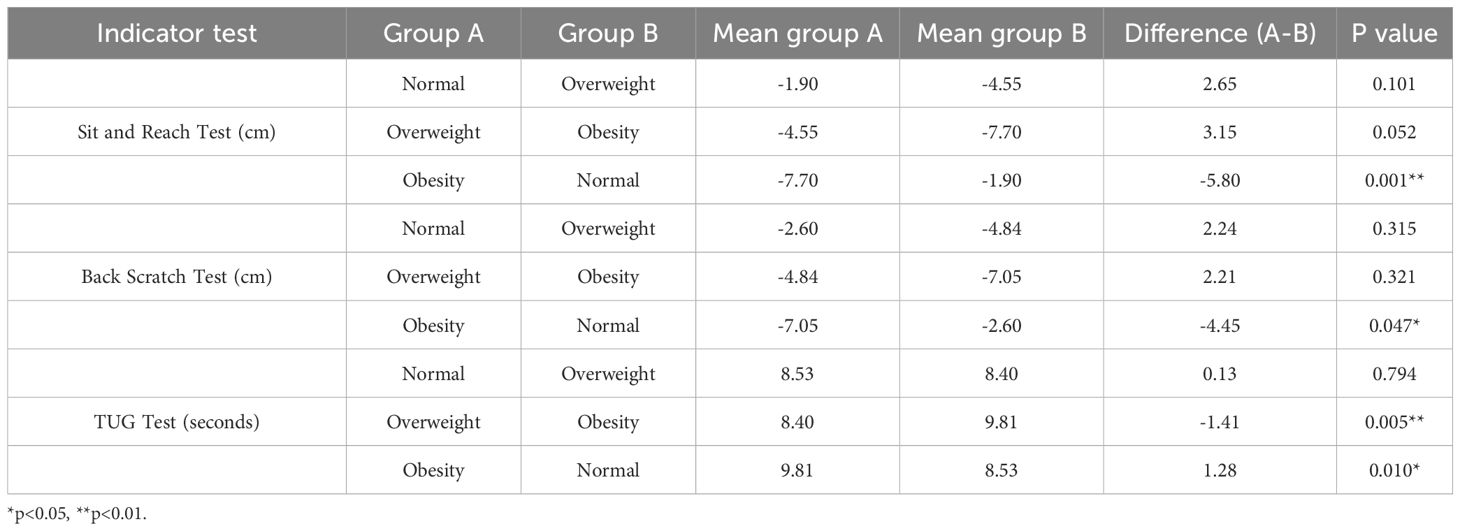 MANOVA results showed that there were significant differences in some flexibility and coordination indicators between different BMI groups when comparing pre- and post-test performances. Further post-hoc comparisons (LSD) revealed the following results. For the sit and reach test, there were no significant differences in the changed performances between the Normal and Overweight Groups or between the Overweight and Obesity Groups (Normal vs Overweight: p=0.101; Overweight vs Obesity: p=0.052). However, there was a significant difference in the changed performances between the Normal and Obesity Groups (Normal vs Obesity: p=0.001). The Obesity Group had lower performances on the sit and reach test than the Overweight Group, and the Overweight Group had lower performances on the sit and reach test than the Normal Group, with the Obesity Group’s performance on the sit and reach test significantly lower than the Normal Group’s. For the back scratch test, there was a significant difference in the changed performances between the Normal and Obesity Groups (Normal vs Obesity: p=0.047); however, there were no significant differences in the changed performances between the Normal and Overweight Groups or between the Overweight and Obesity Groups (Normal vs Overweight: p=0.315; Overweight vs Obesity: p=0.321). The Obesity Group had lower pre- and post-test performances on the back scratch test than the Overweight Group, and the Overweight Group had lower performances on the back scratch test than the Normal Group, with the Obesity Group’s performances on the back scratch test significantly lower than the Normal Group’s. For the TUG test, there were significant differences in the changed performances between the Normal and Obesity Groups as well as between the Overweight and Obesity Groups (Normal vs Obesity: p=0.010; Overweight vs Obesity: p=0.005). By contrast, there was no significant difference in the changed performances between the Normal and Overweight Groups (Normal vs Overweight: p=0.794). The Obesity Group had the longest time, followed by the Normal Group and the Overweight Group. The Obesity Group’s performance on the TUG test was significantly higher than both the Normal and Overweight Groups (Table 7).