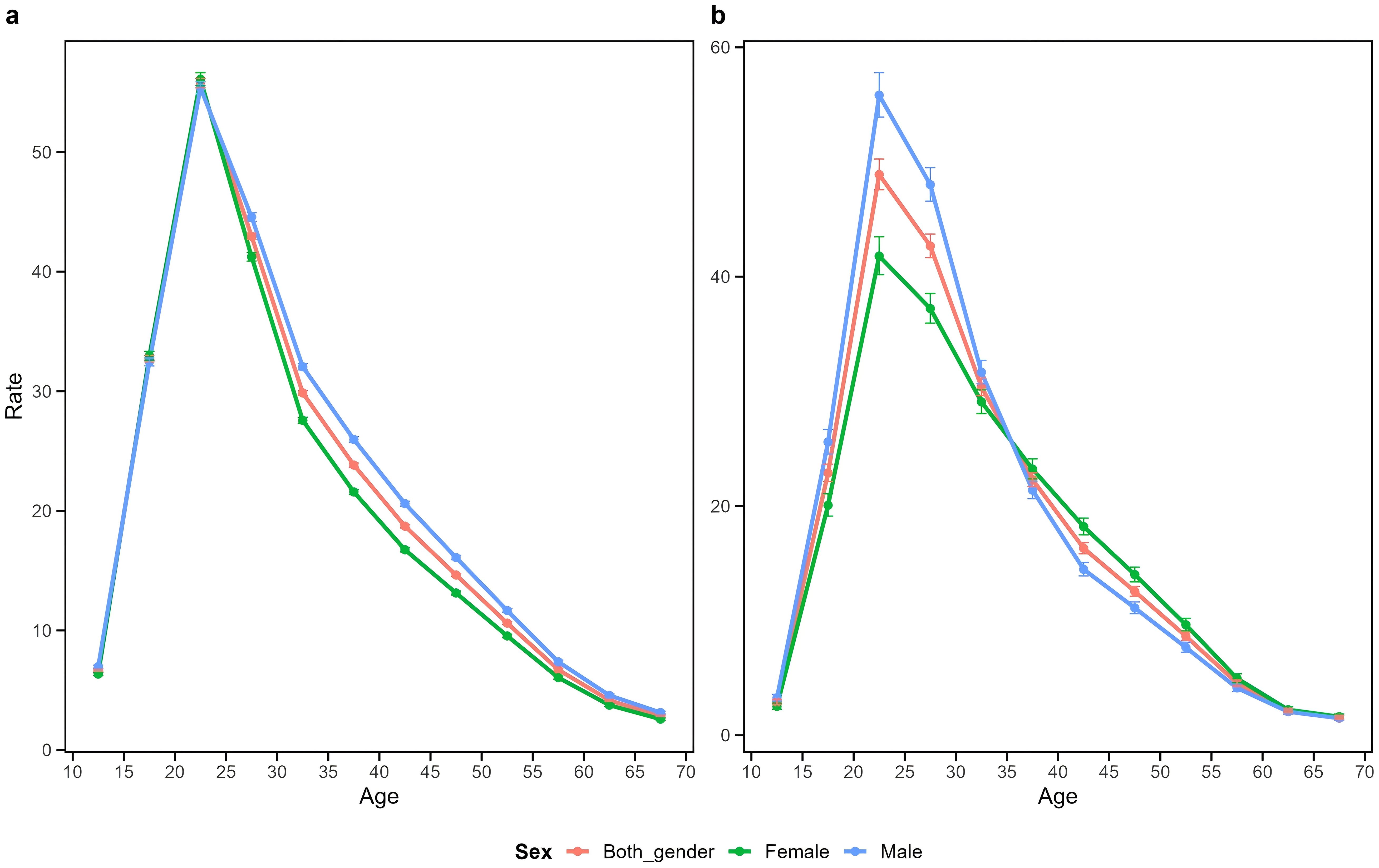 Figure 3. Longitudinal age curves for schizophrenia incidence in China (a) and Japan (b). Fitted longitudinal age-specific incidence rates of schizophrenia (per 100,000 person-years) and their corresponding 95% confidence intervals, with the 35–39 age group as the reference.