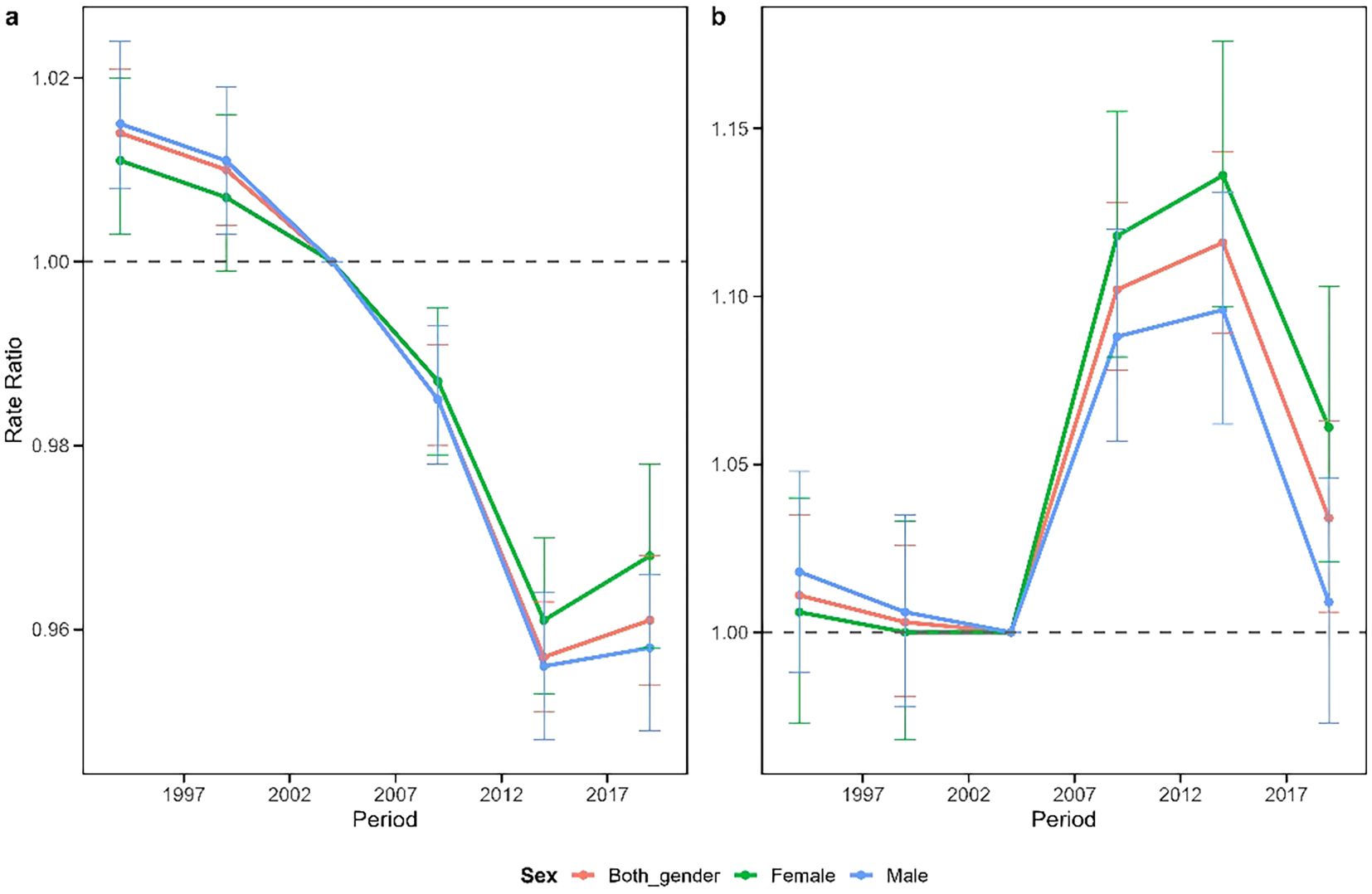 Figure 4. Comparison of the periodicity of schizophrenia in China (a) and Japan (b). The periodic effects of schizophrenia incidence obtained through age-period-cohort analysis and their corresponding 95% confidence intervals, with 2002–2006 as the reference period.
