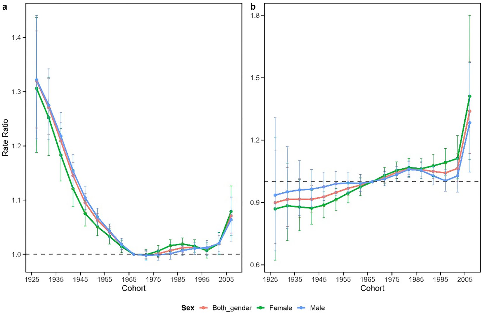 Figure 5. Cohort incidence ratio of mental disorders in China (a) and Japan (b). Cohort effects of schizophrenia incidence obtained through age-period-cohort analysis and their corresponding 95% confidence intervals, with the 1965–1969 cohort as a reference.
